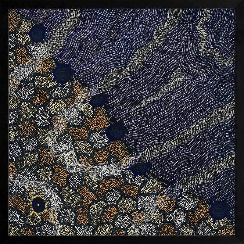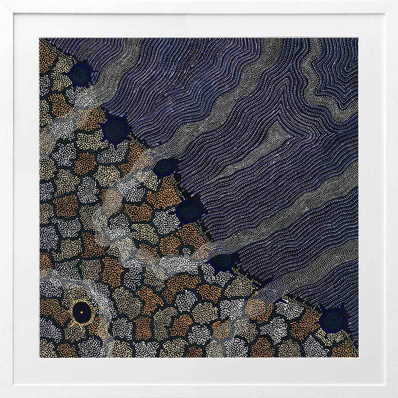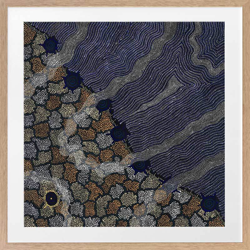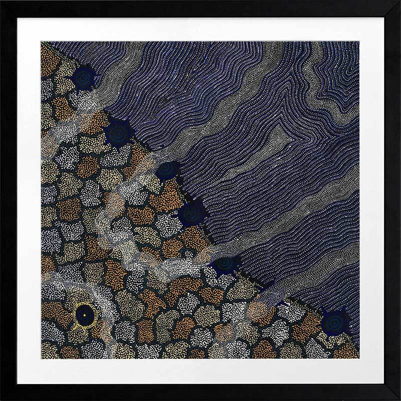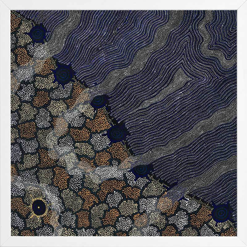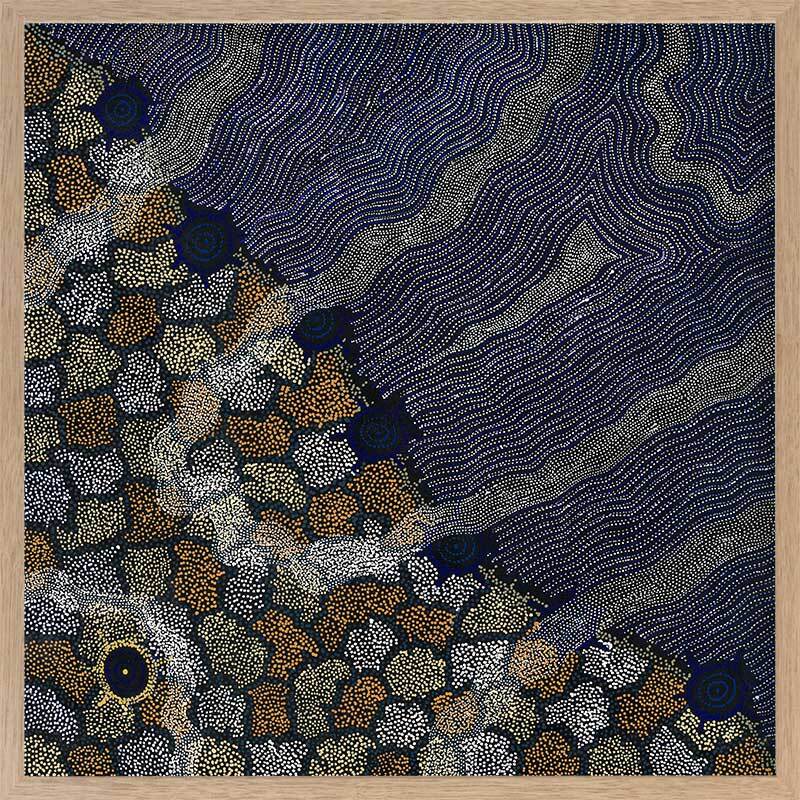 Napalijarri-warnu Jukurrpa (Seven Sisters Dreaming) Framed Art Print - Elaborate and moody, this piece brings a layered effect to your space with juxtaposing patterns depicted on either side of the canvas. Mesmerising linework and abstract shapes enhance the neutral palette of deep blue, warm orange-toned beige, and soft white tones.