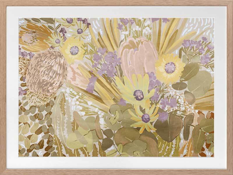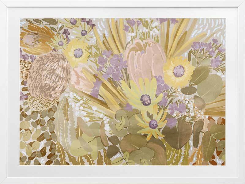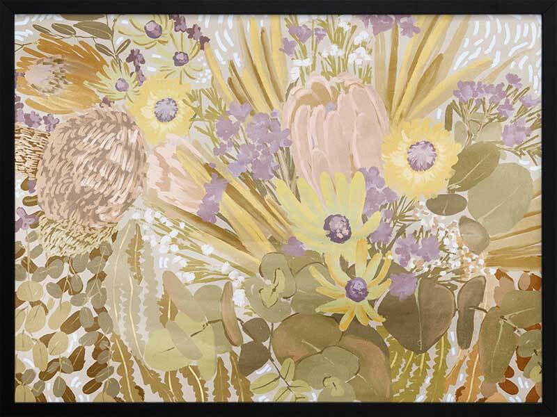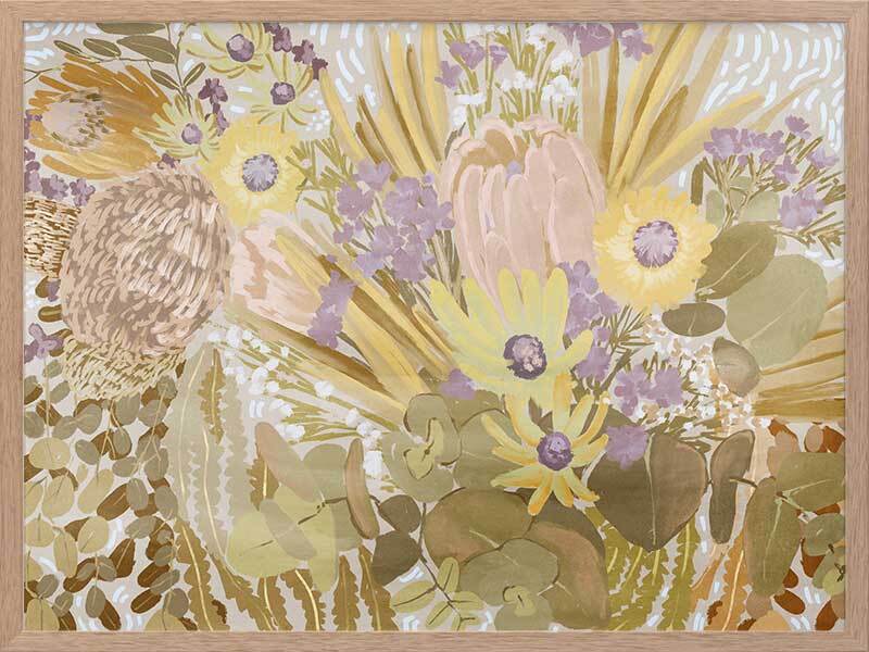 Native Brush I Framed Art Print - A burst of native Australian plants and flowers will breathe life into your wall, with a muted palette of Tuscany yellow, soft purple, and various shades of tan and olive green. Small, white brush strokes at the top and centre portray the gentle sway of each plant in a warm breeze.