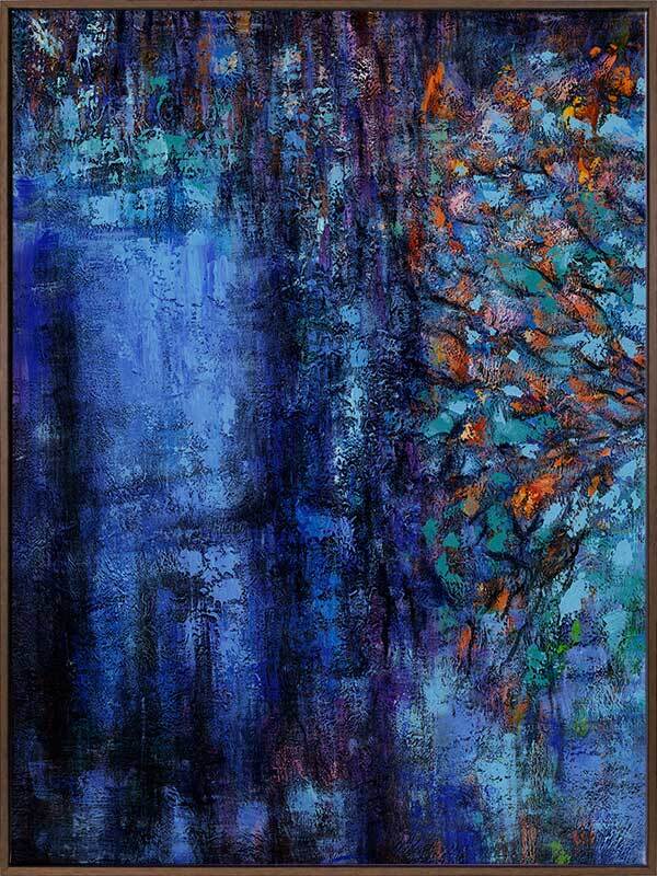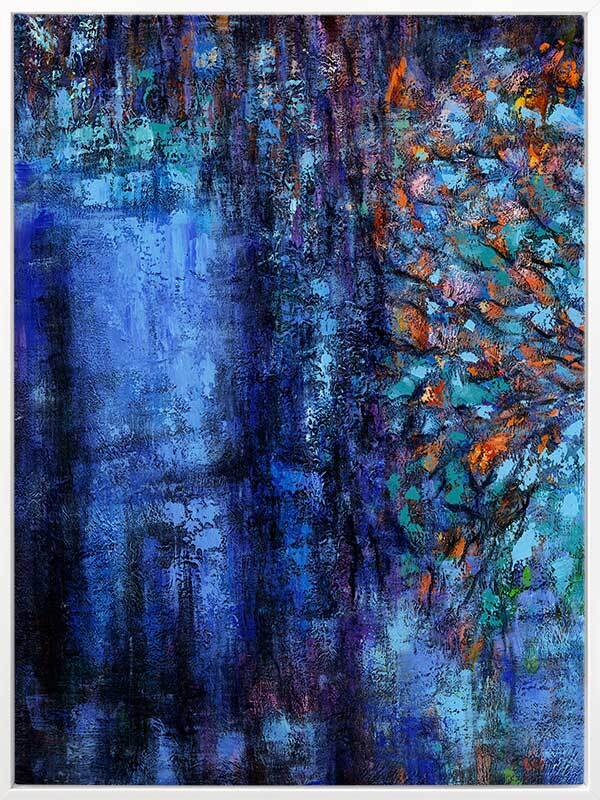 Navi Canvas Art Print - A vibrant abstract artwork featuring a beautifully textured background of deep and electric blues with pops of orange and green.