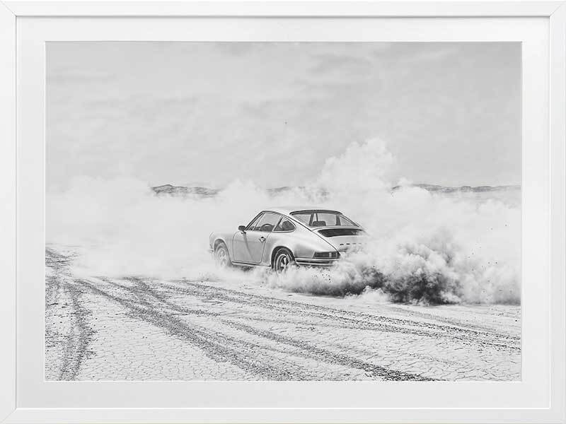 Need for Speed I Framed Art Print - In this photographic artwork, a retro car powers through a desert landscape, leaving trails of dust and smoke in its wake, with a monochrome palette that enhances the sense of unbridled freedom. This wall art, with its retro and mid-century modern vibes, is perfect for adding a dynamic touch to any room. Ideal for those who appreciate the thrill of the open road and the timeless appeal of American modern style.