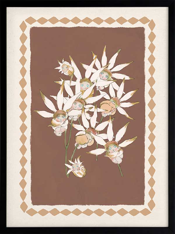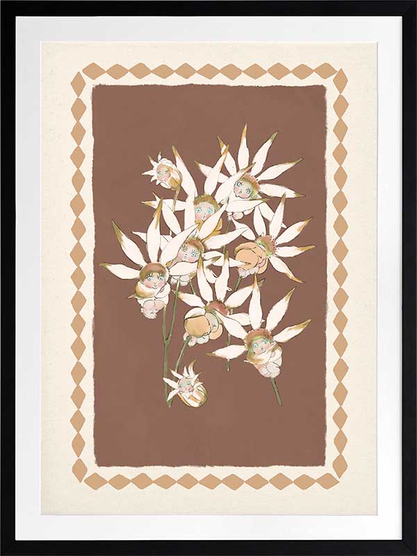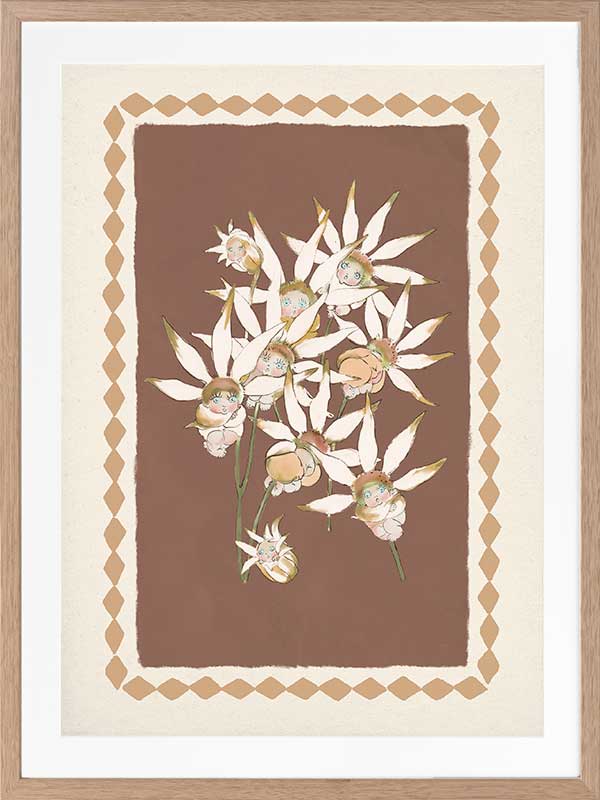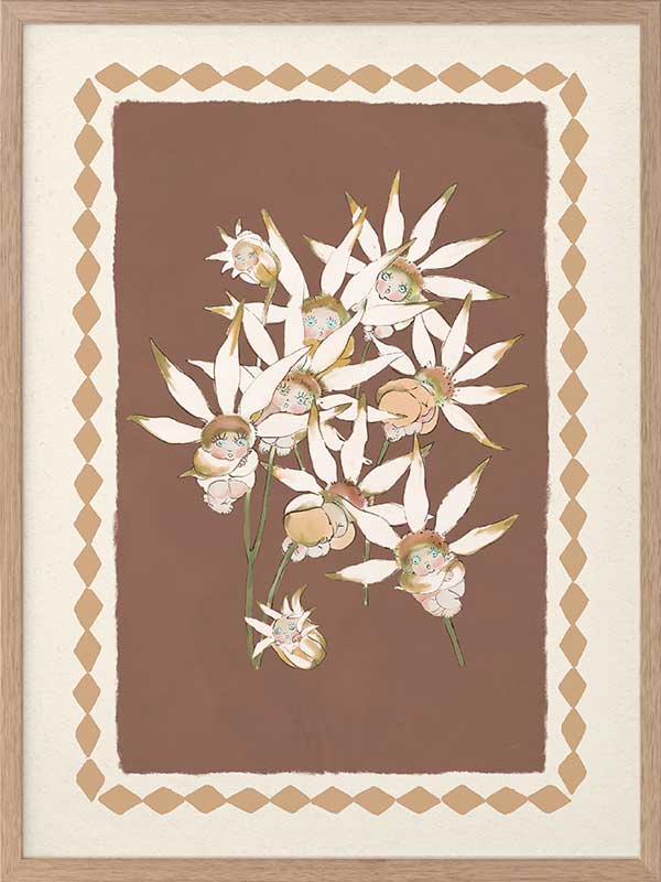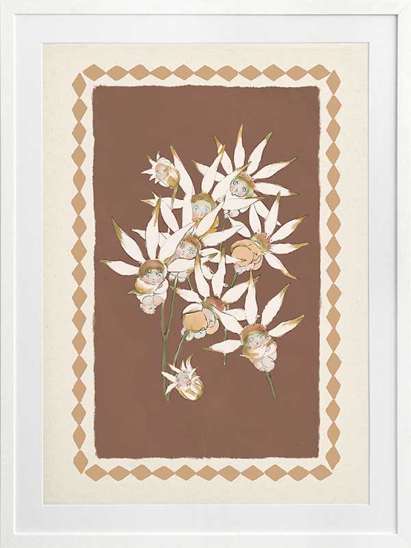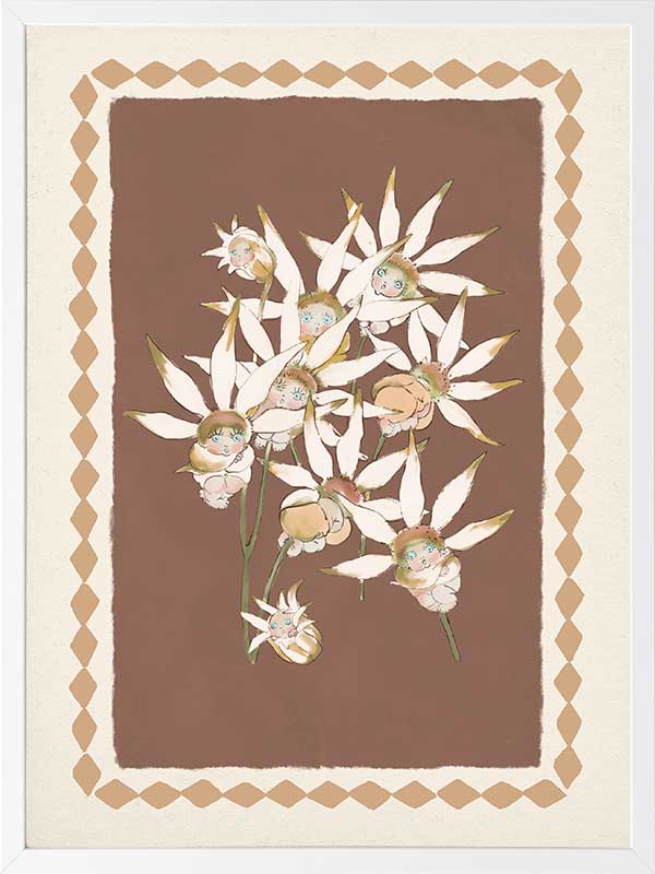 With its warm terracotta backdrop and soft white blooms, this artwork from the Urban Road X May Gibbs Artwork Collection captures the quiet elegance of Australia’s native bushland.
