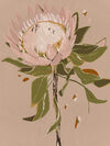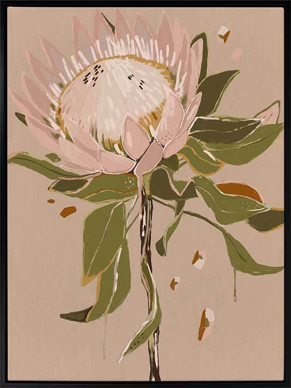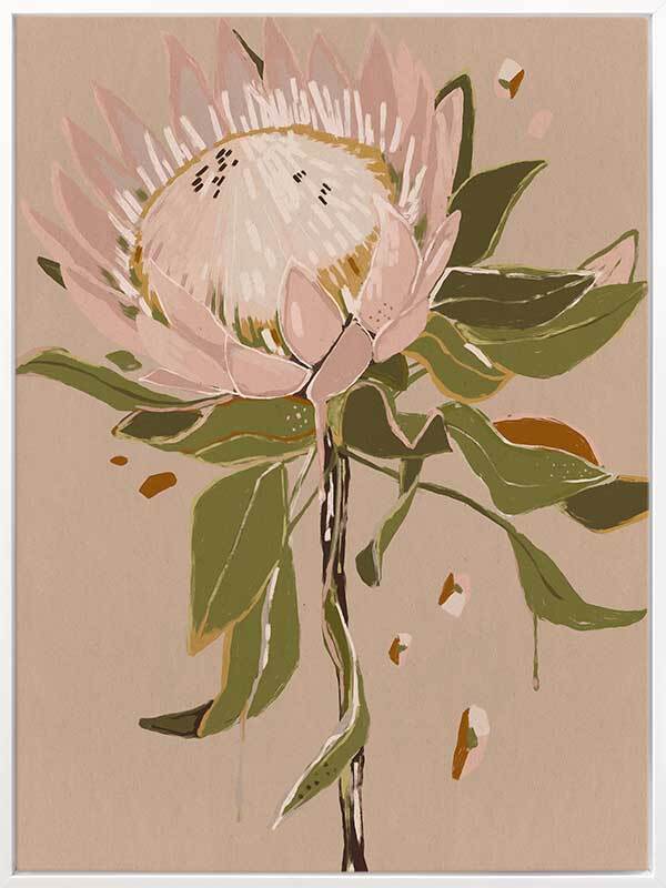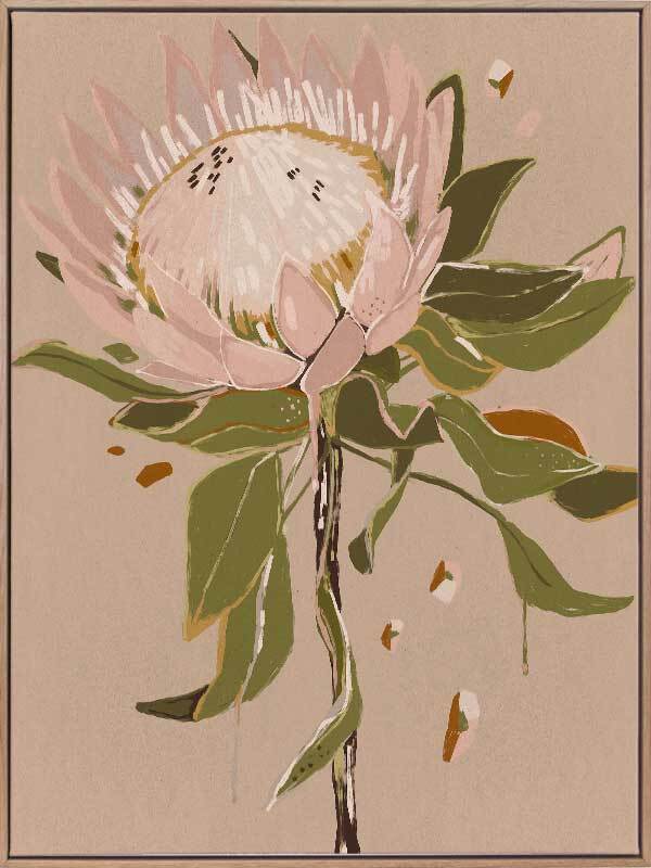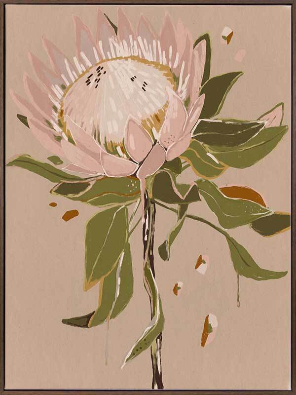 Neutral Protea Canvas Art Print - Warm and feminine, this painterly style artwork is the perfect addition to the home of any lover of Australiana. Featuring a warm, soft pink and beige protea flower with khaki green leaves against a textured nude background, the neutral colour palette is delicate and easy to match. Pairs with Neutral Waratah.