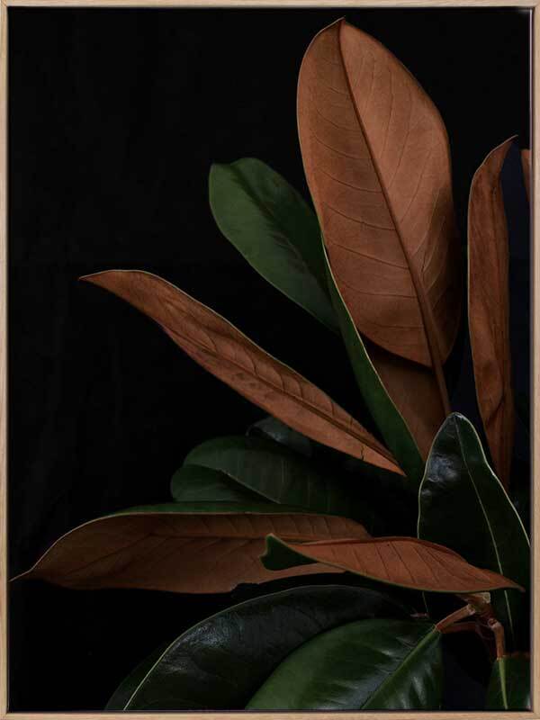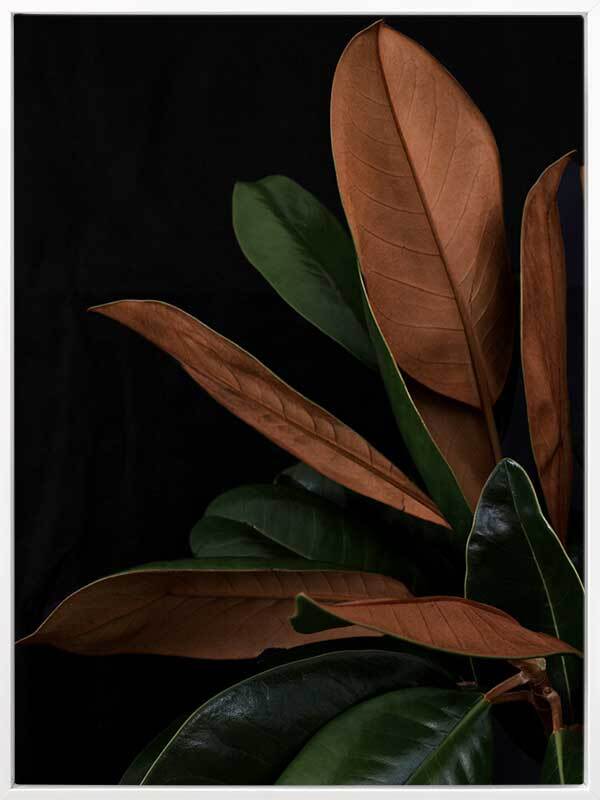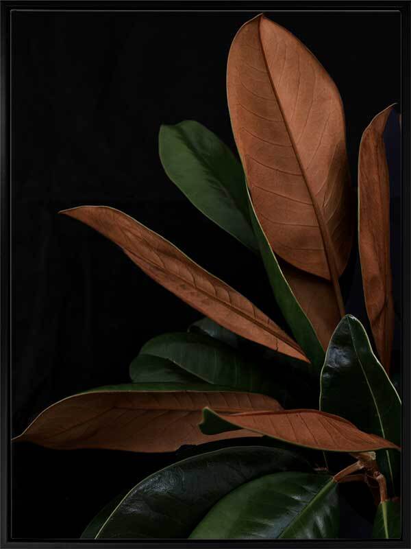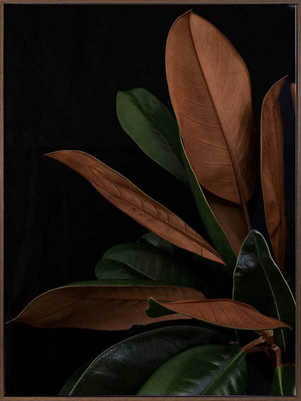 New Leaf Canvas Art Print: A striking photographic print featuring a stem of Magnolia leaves against a stark black background. 2019 AUTUMN/WINTER COLLECTION: ODYSSEY