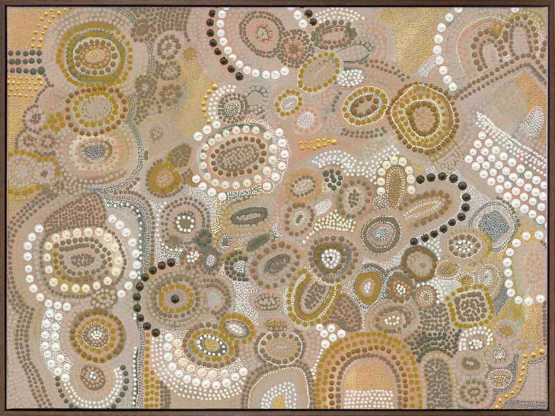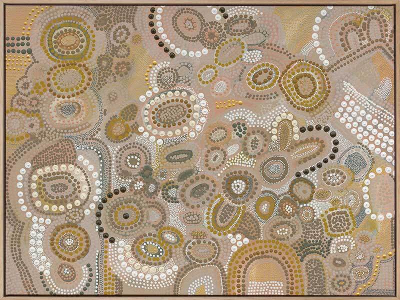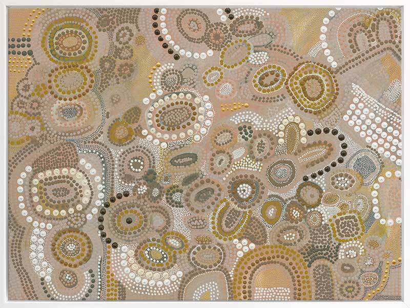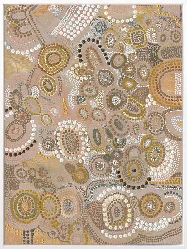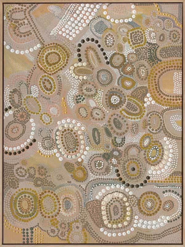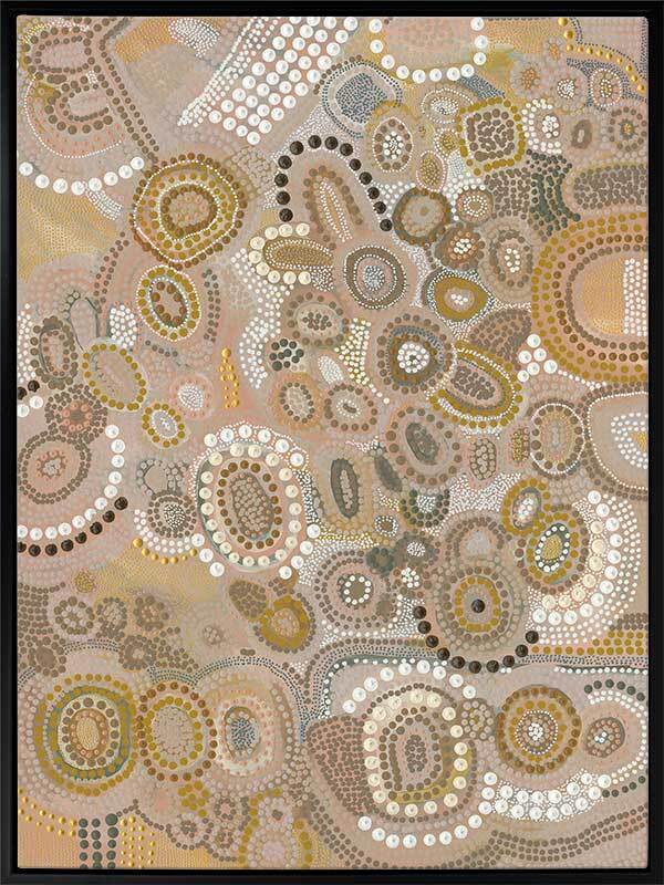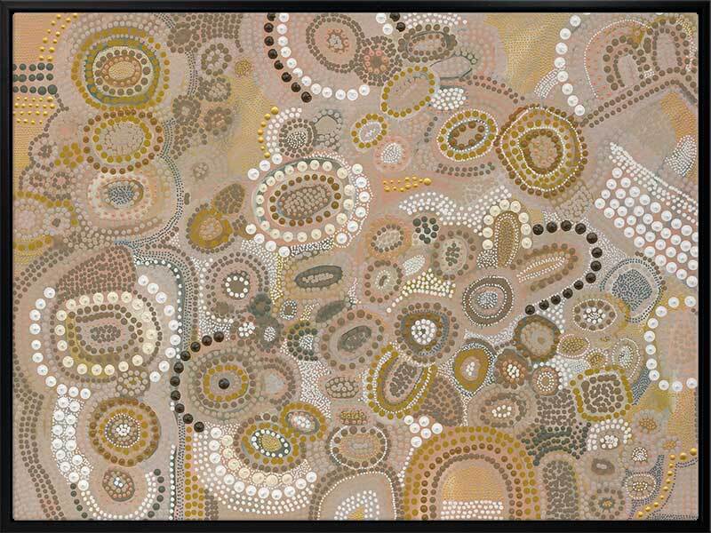 This piece is a representation of the Dreaming - the time of creation. It was during this time the land was shaped, the rivers and mountains were formed, and animals, people and plants were born. The stories of creation have been passed down like letters from our ancestors from generation to generation.