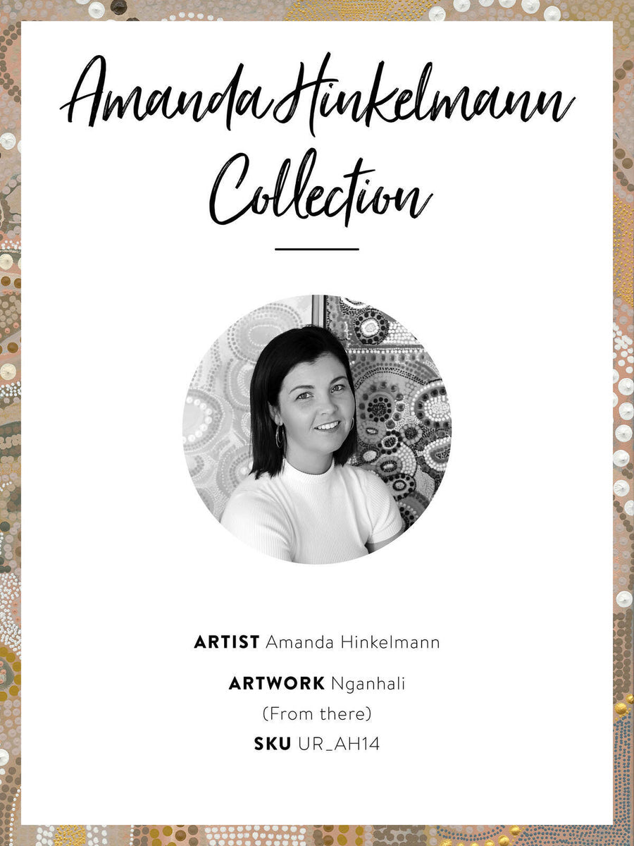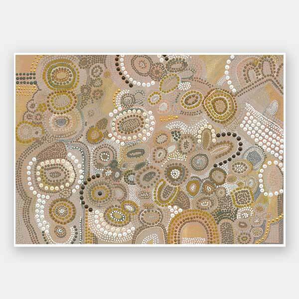 Nganhali Unframed Art Print - Light, earthy and deeply grounded in rich ancestral culture, this contemporary Indigenous Aboriginal artwork has been created by Wiradjuri artist Amanda Hinkelmann. Featuring clusters of intricately painted concentric circles, surrounding three hill like structures, the piece is representative of the Creation period - where all life came into being. The colour palette features a warm midtone colour palette of mustard, ochre, clay and white. A complimentary piece to Dharrang, Marramarra and Wiraywinhangin Marramarra, as a part of Amanda's visual representation of the Dreaming.