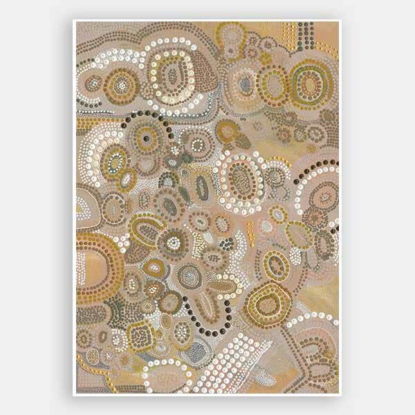 This piece is a representation of the Dreaming - the time of creation. It was during this time the land was shaped, the rivers and mountains were formed, and animals, people and plants were born. The stories of creation have been passed down like letters from our ancestors from generation to generation.
