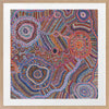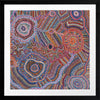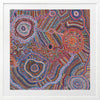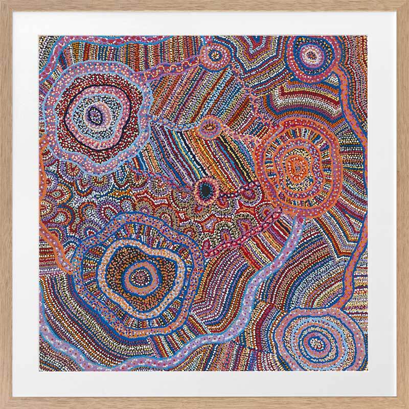 Ngapa Jukurrpa II Framed Art Print - A colourful and visually striking Indigenous Aboriginal artwork piece that sees songlines of meticulously placed dots and lines radiating from central circles, representing soakages. The colour palette is a kaleidoscope of purples, blues, reds and oranges.