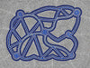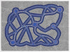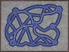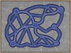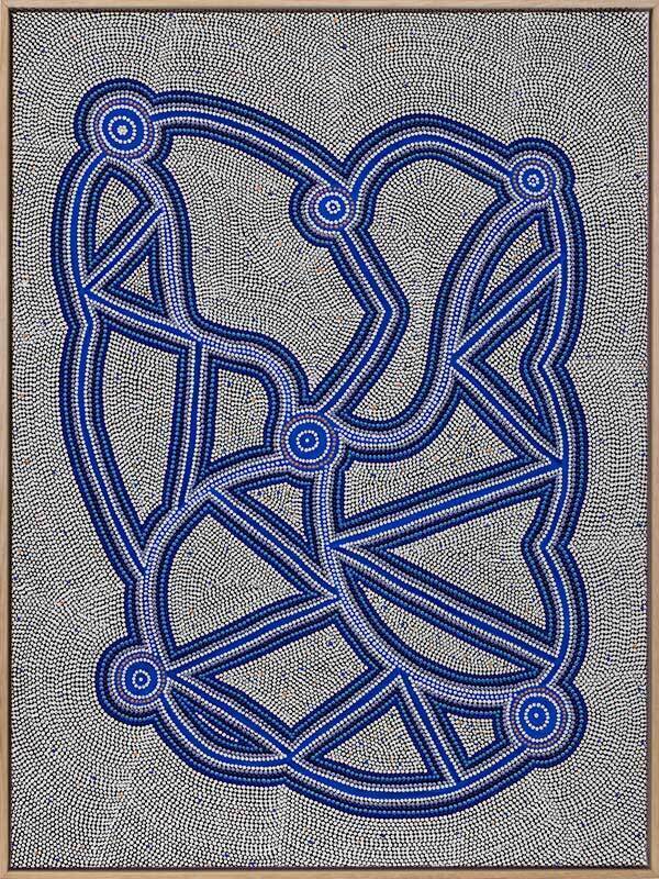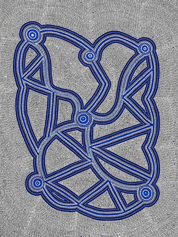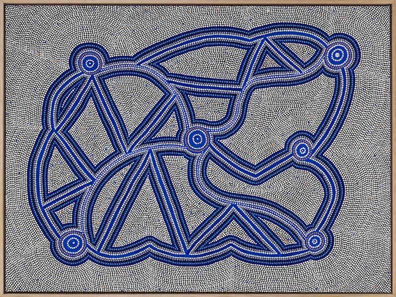 This Indigenous Aboriginal artwork depicts the water Dreaming, and tells a story of two Jangala men, rainmakers, who sang for the rain and unleashed a giant storm. The storm travelled from the east to the west until it reached Warlura, a waterhole to the east of Yuendumu in the Northern Territory. At Warlura, a gecko blew the storm away. The storm continued on, covering the lands with rain and shooting out bolts of lightning, awakening the 'kurdukurdu mangkurdu Jukurrpa' (children of the clouds Dreaming).