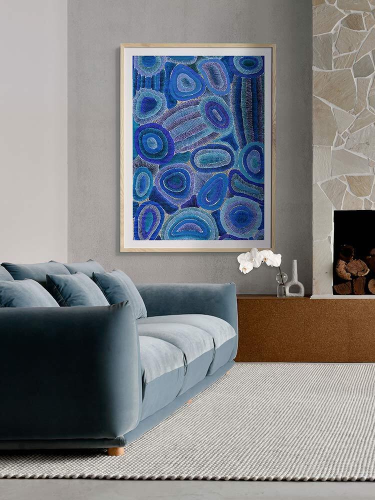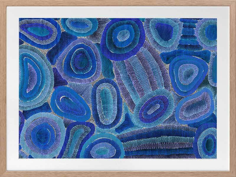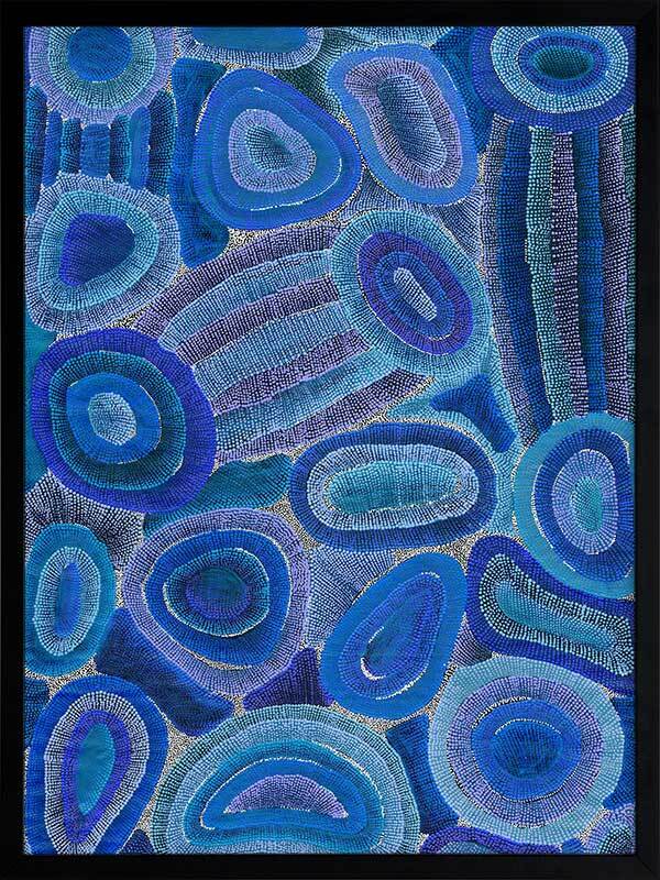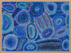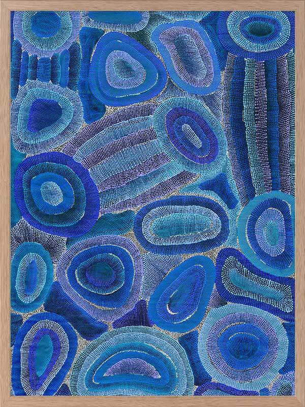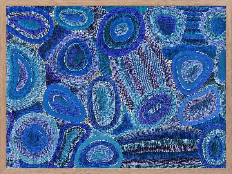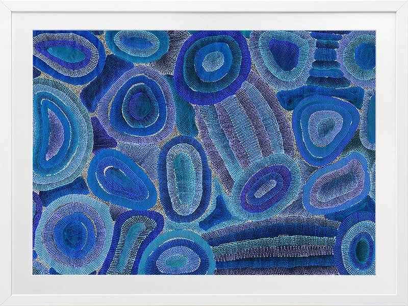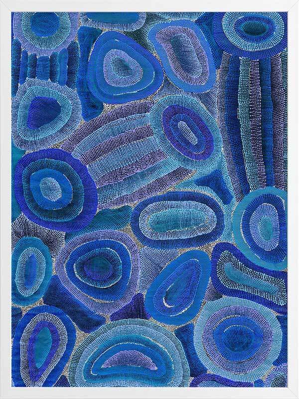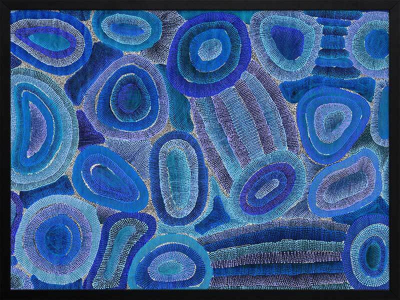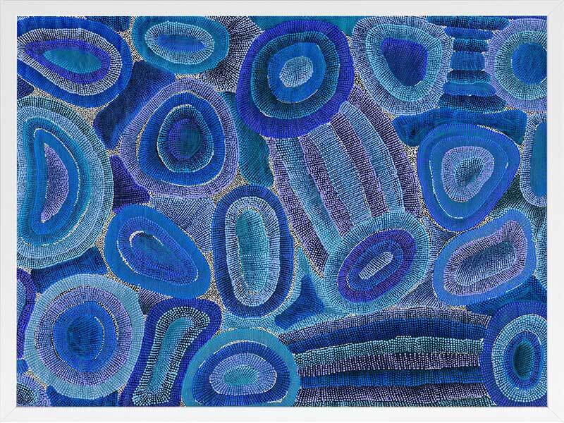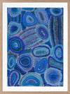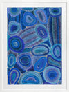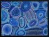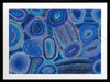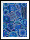 Ngapa Jukurrpa IV Blue Framed Art Print - This Indigenous Aboriginal artwork, an artistic interpretation of the Water Dreaming, features bold, brilliant circular shapes formed by intricately placed dots in a spectrum of vibrant blue tones.