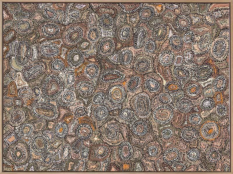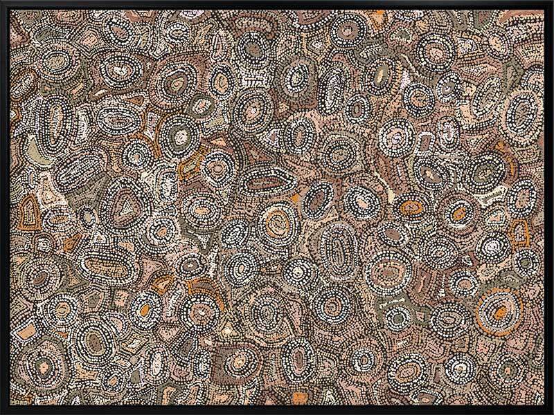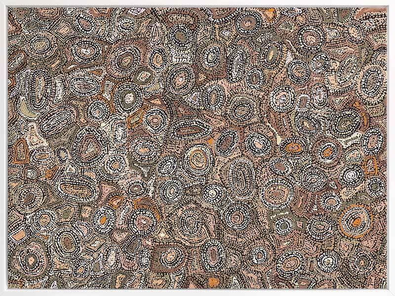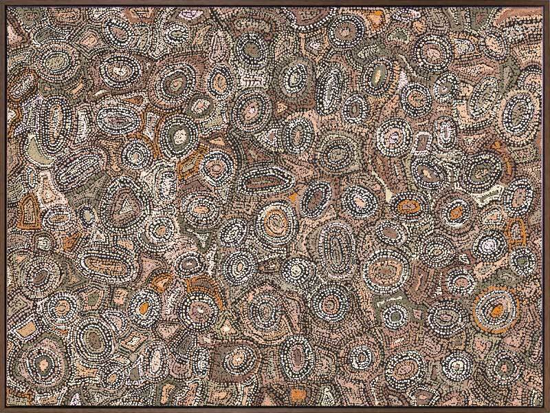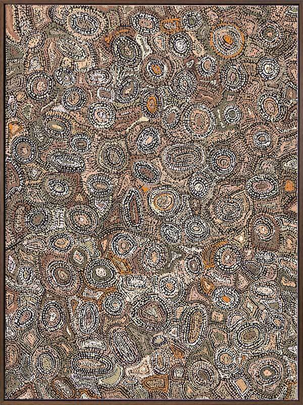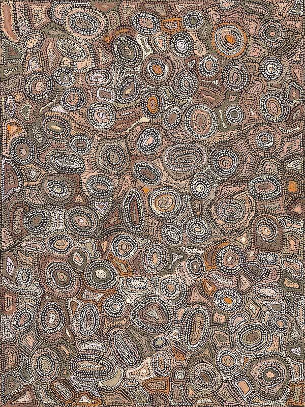 Portraying Puyurru, west of Yuendumu, this piece tells the story of Water Dreaming. Two Jangala men, rainmakers, sang to unleash a giant storm, which travelled across Country from east to west.