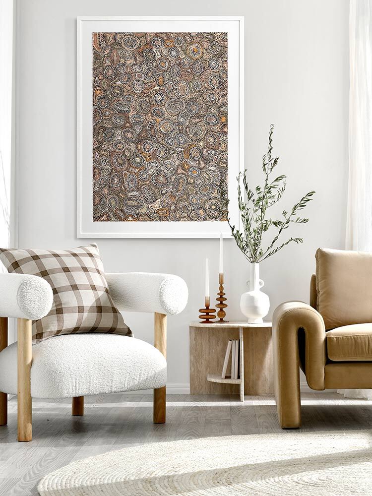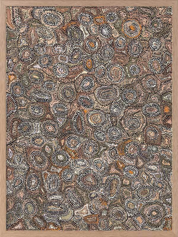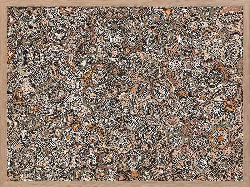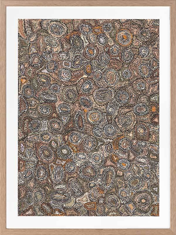 Ngapa Jukurrpa (Water Dreaming) Framed Art Print - Highly detailed and contemporary in style, this breathtaking piece features a cluster of uneven shapes, short dashes, and longer flowing lines, all moving together in harmony. A fairly neutral palette includes predominantly beige tones, with touches of bright orange, blush and yellow. Perfect for amplifying any wall, and easy to incorporate with various interior styles.