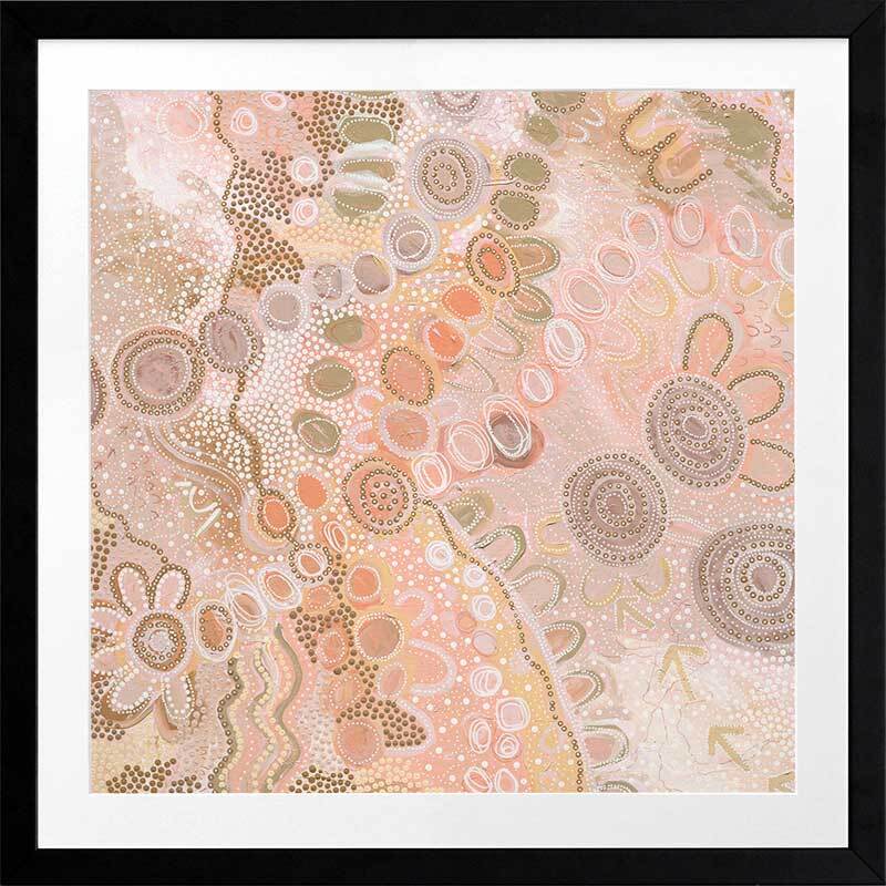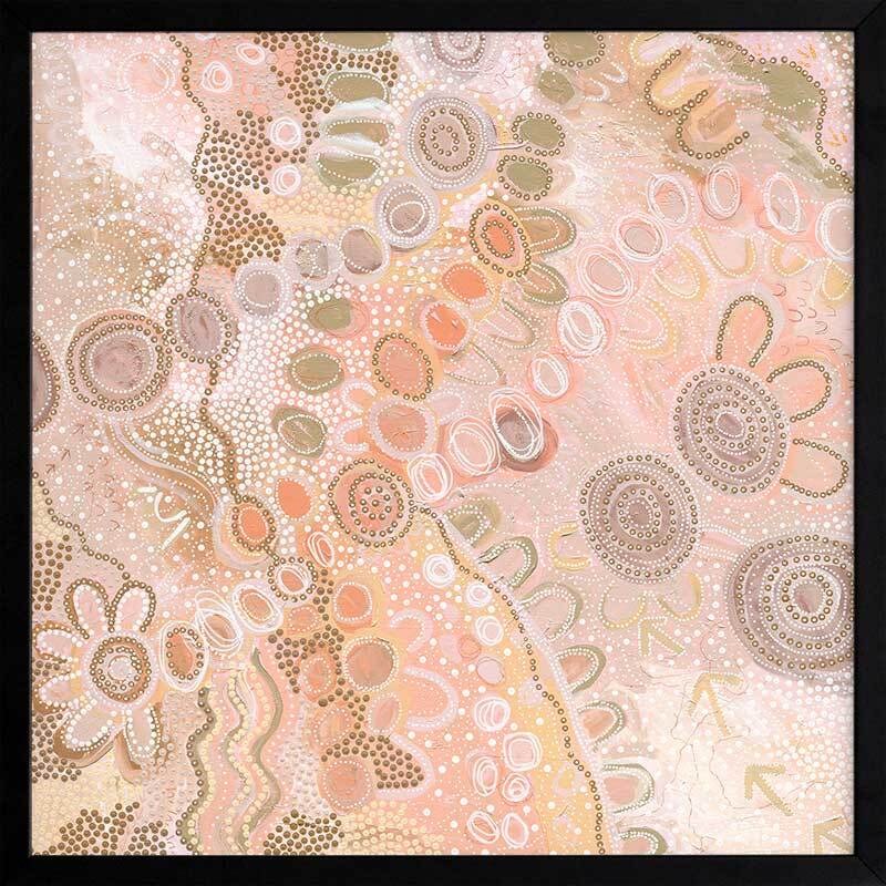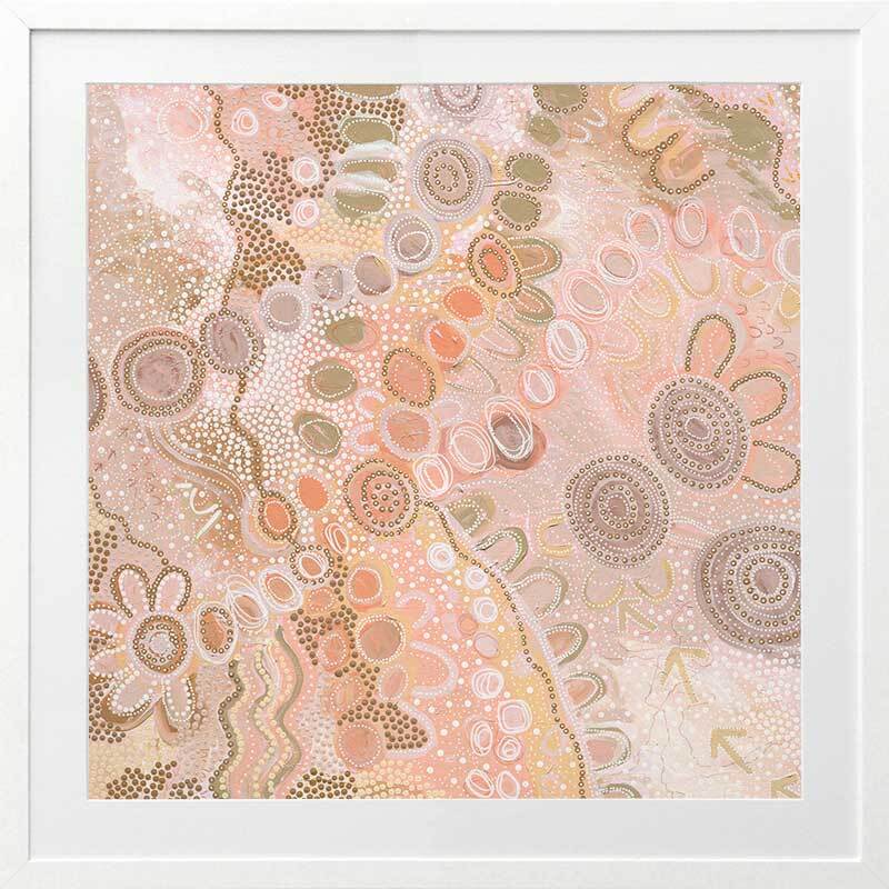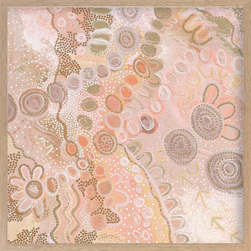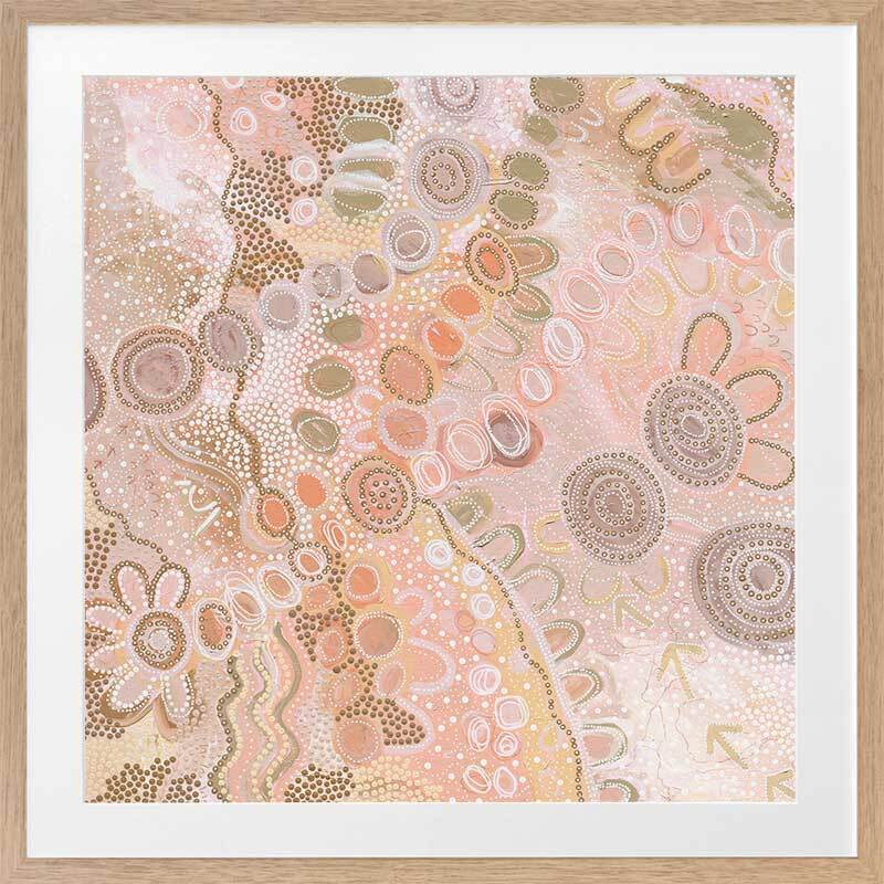 Ngu-Nha Framed Art Print - Delicate and sweet, this gorgeous Indigenous Aboriginal artwork takes traditional flora and fauna patterns, blending them with a contemporary, delicate palette. Muted brown stands out among pale pinks and yellows, while a vibrant orange accent beams in the centre.