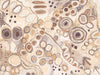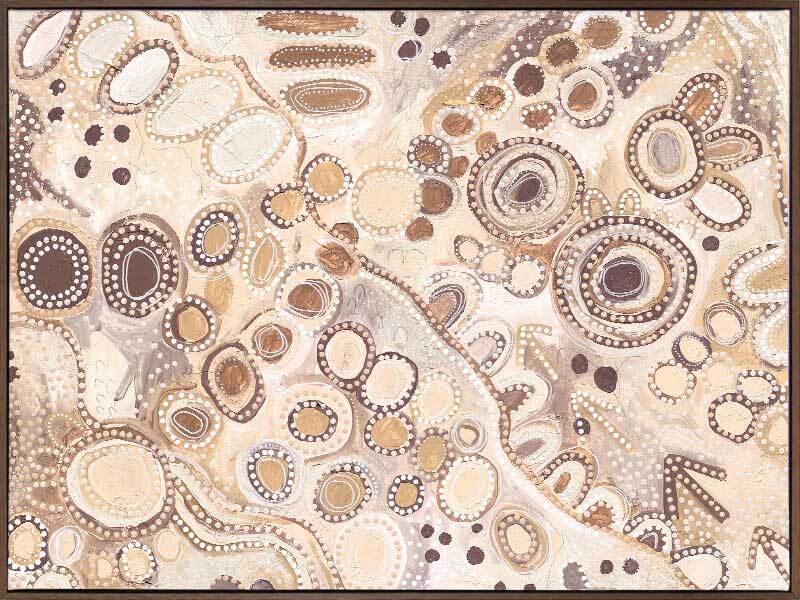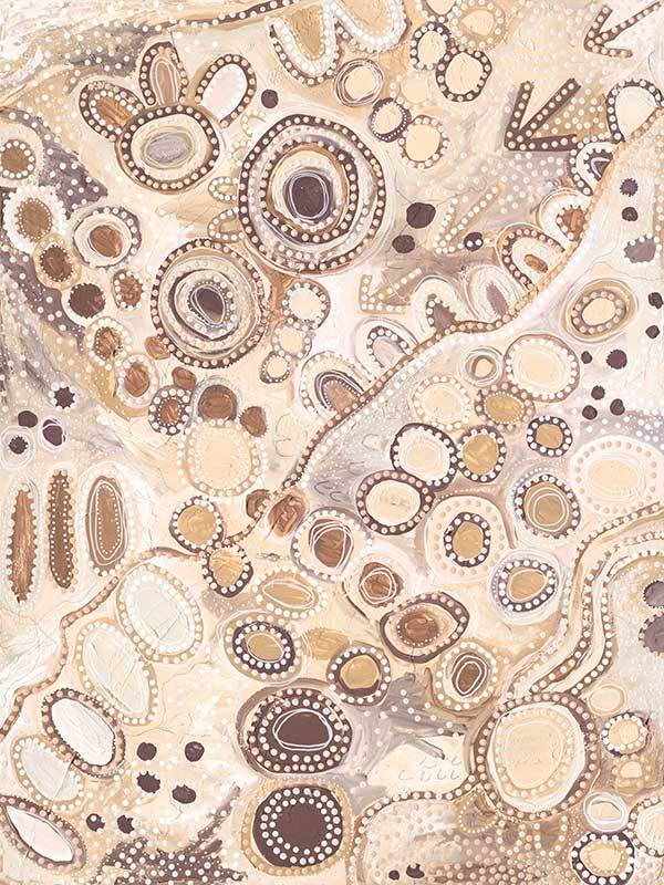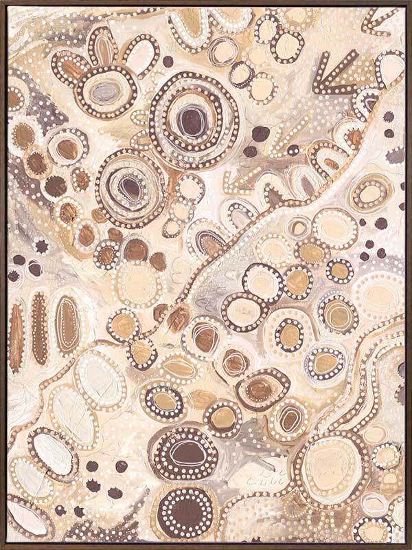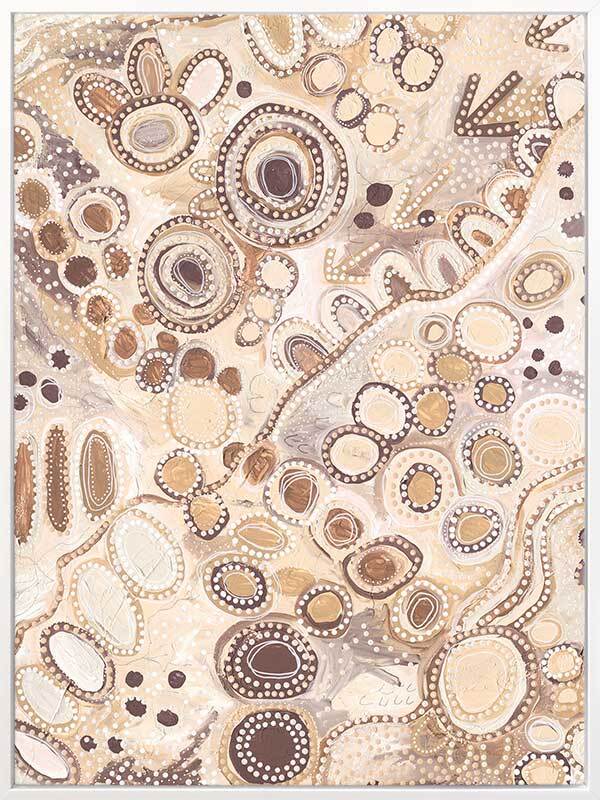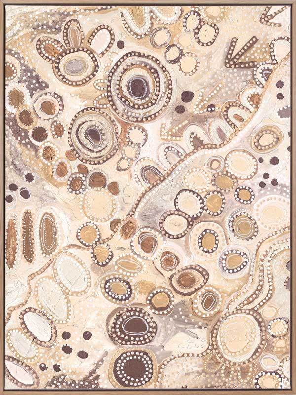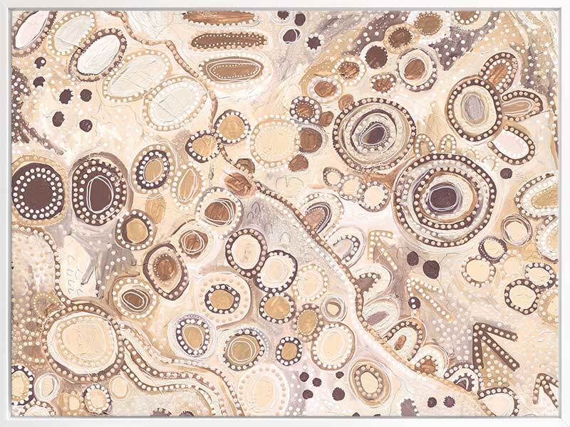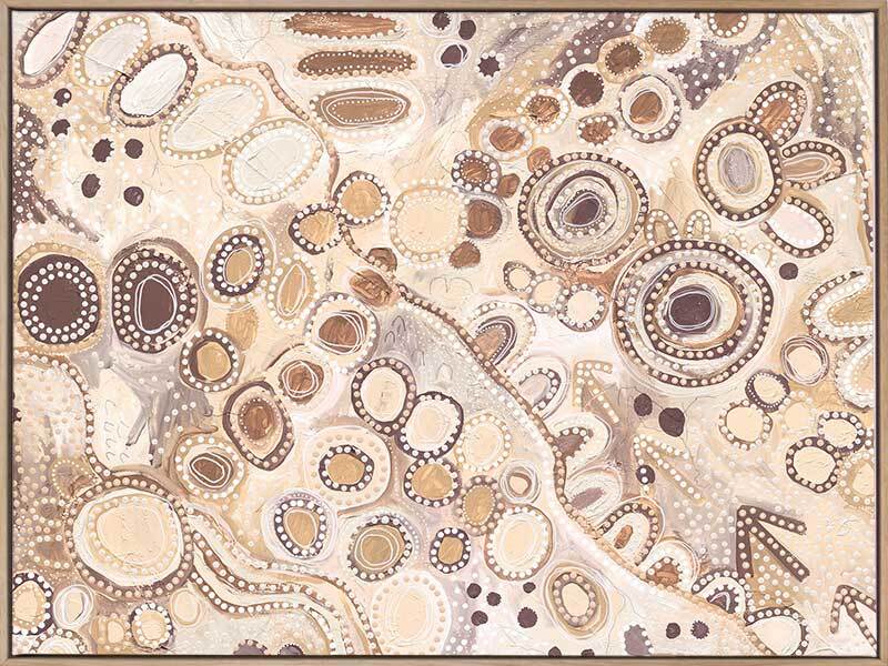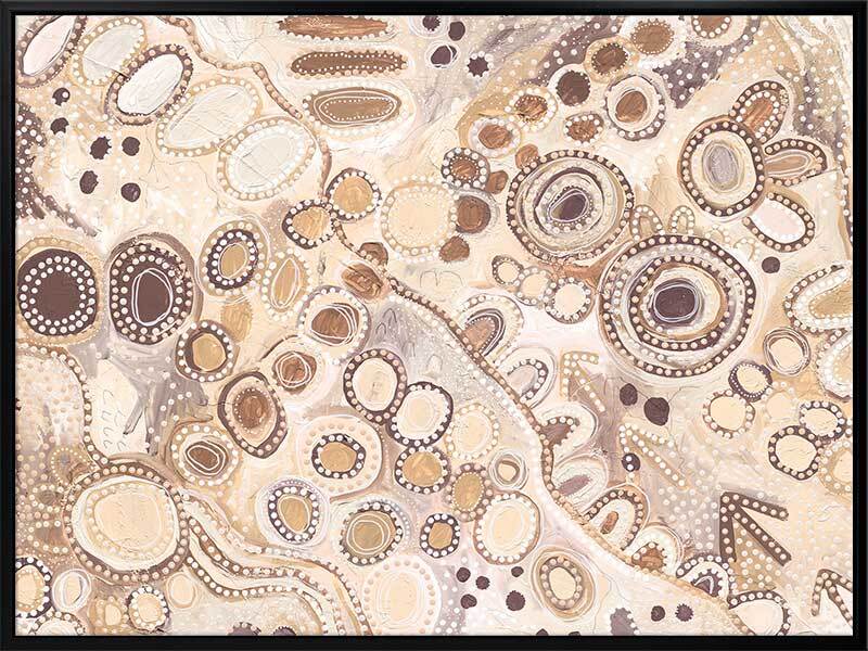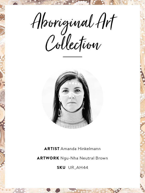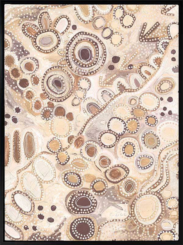 Ngu-Nha Neutral Brown Canvas Art Print - Bursting with life, this Aboriginal artwork by Wiradjuri artist, Amanda Hinkelmann, enriches any space with its vibrant design and intricate circular shapes and flowing lines. Using traditional Indigenous dot painting techniques and a soft palette of muted brown and beige shades, this piece creates a comforting and inviting atmosphere.