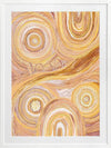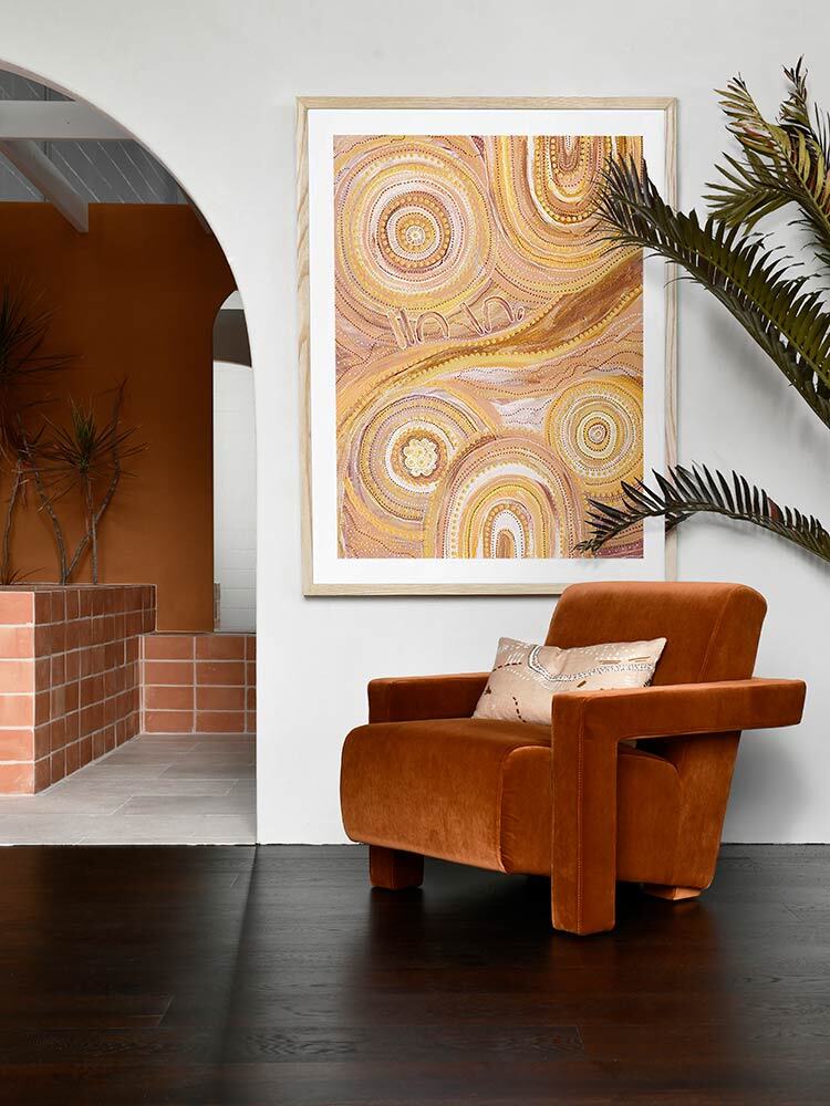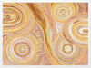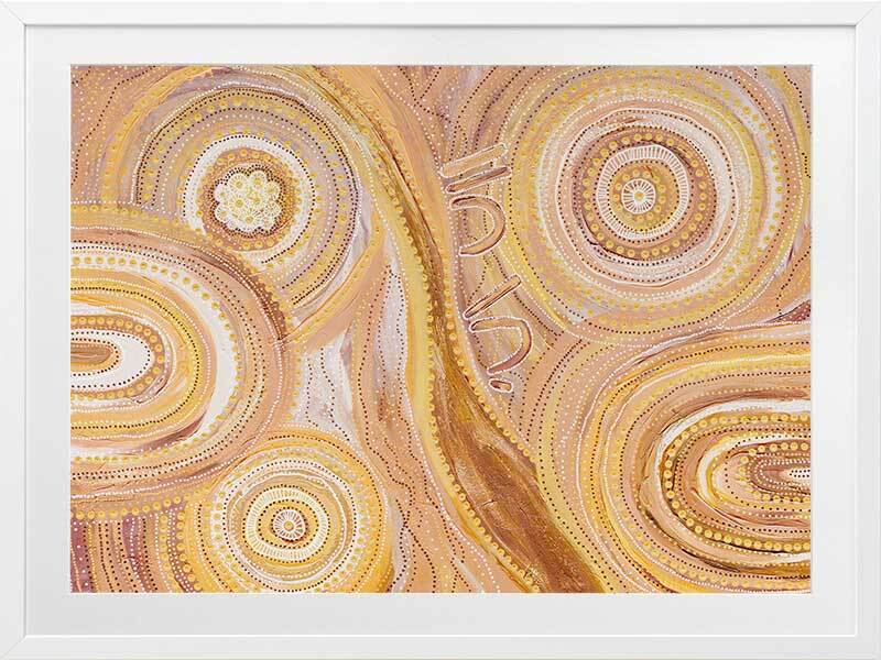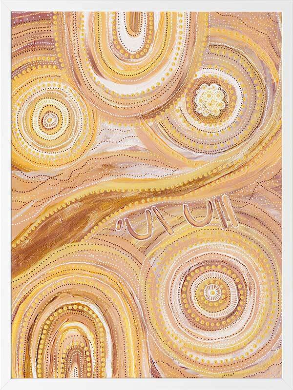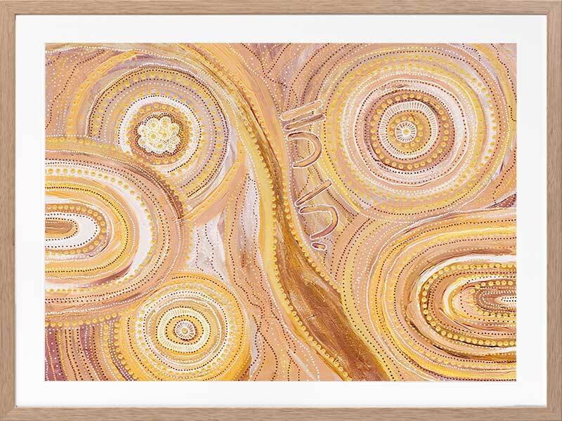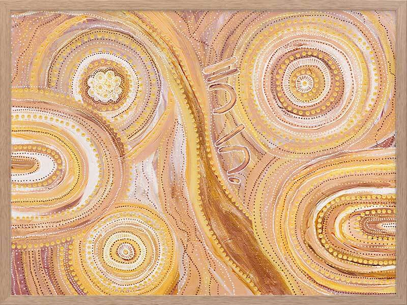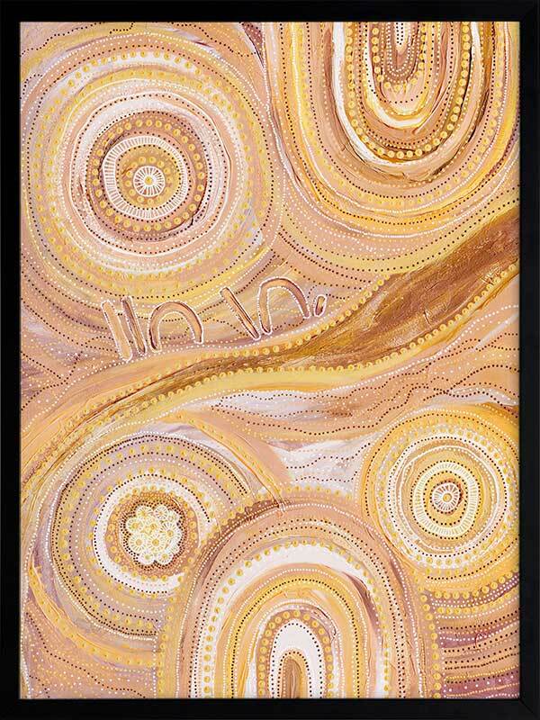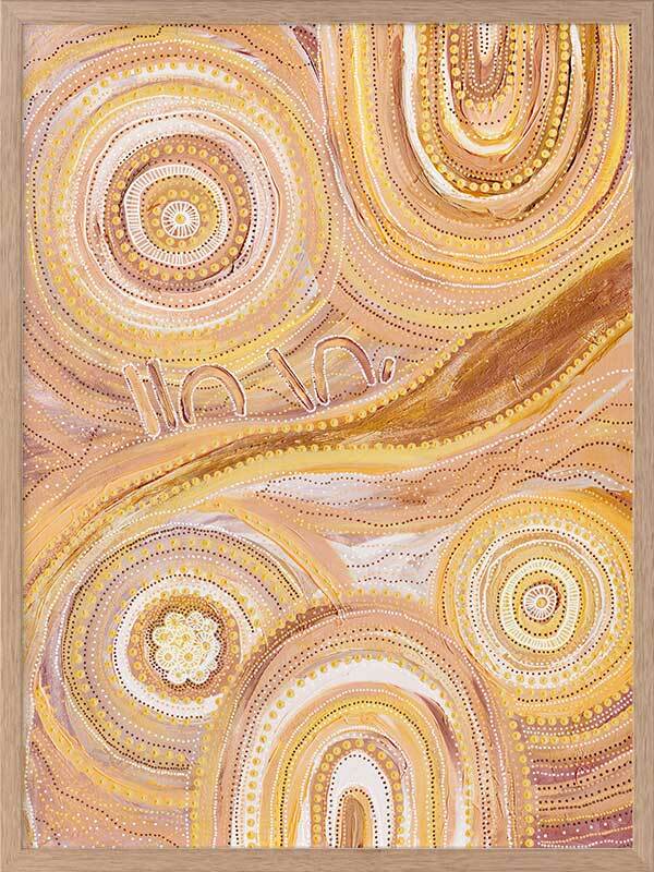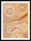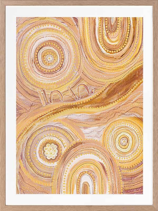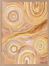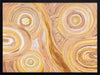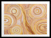 Ngurrbul Light Framed Art Print - Free flowing lines are surrounded by hypnotic and intricate concentric circles in this warm, radiant contemporary Indigenous Aboriginal artwork piece. Created by talented Wiradjuri artist, Amanda Hinkelmann, this piece is inspired by a traditional Wiradjuri love story, and features a light, earthy colour palette of yellow, ochre, peach and burgundy tones.