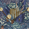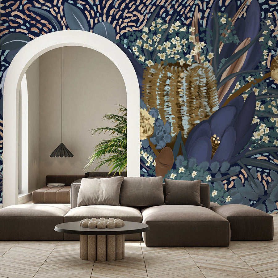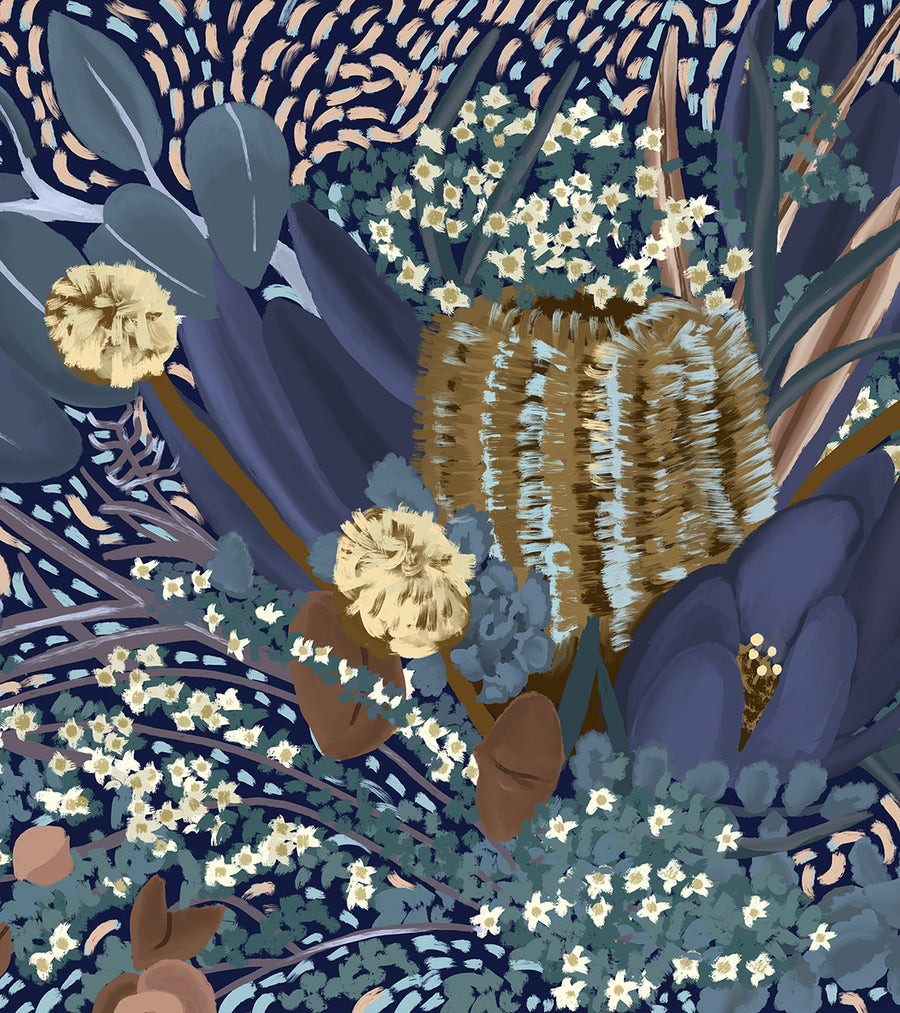 Nightfall II Wallpaper - As night falls over the Australian bush, a blooming banksia comes to life. Under the soft glow of moonlight, a cool colour palette of blues and greens contrast warmer beige, yellow and light orange shades, encompassing the stillness of the night. A versatile wallpaper pattern for most interior styles.
