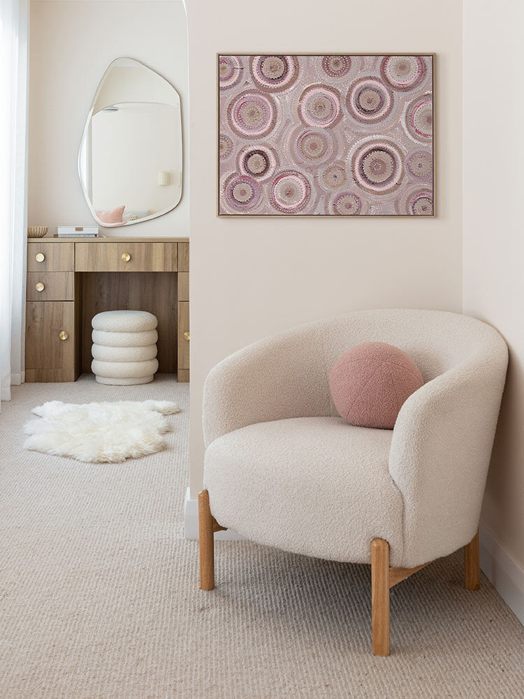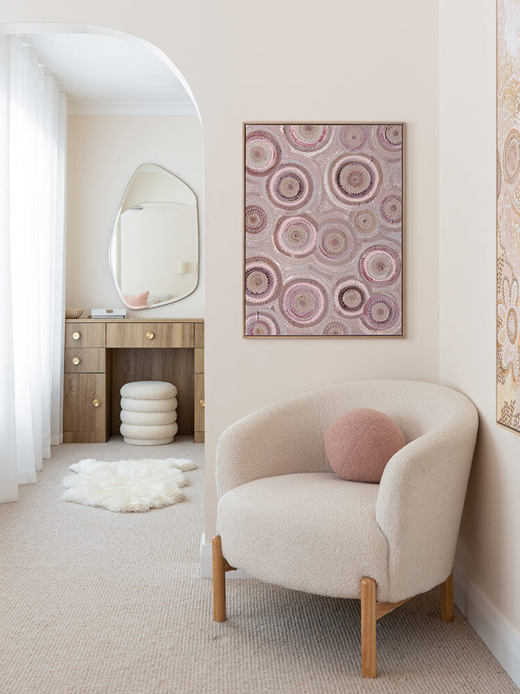 This versatile collection of Indigenous art by renowned Wiradjuri artist, Amanda Hinkelmann, features an expressive neutral palette in multiple colourways, including muted brown, blue, green, and pink tones. Perfect for celebrating NAIDOC Week 2024, these Aboriginal art pieces bring warmth, comfort, and a touch of elegance to your space. Support First Nations art and let your walls tell stories rich in culture and heritage.