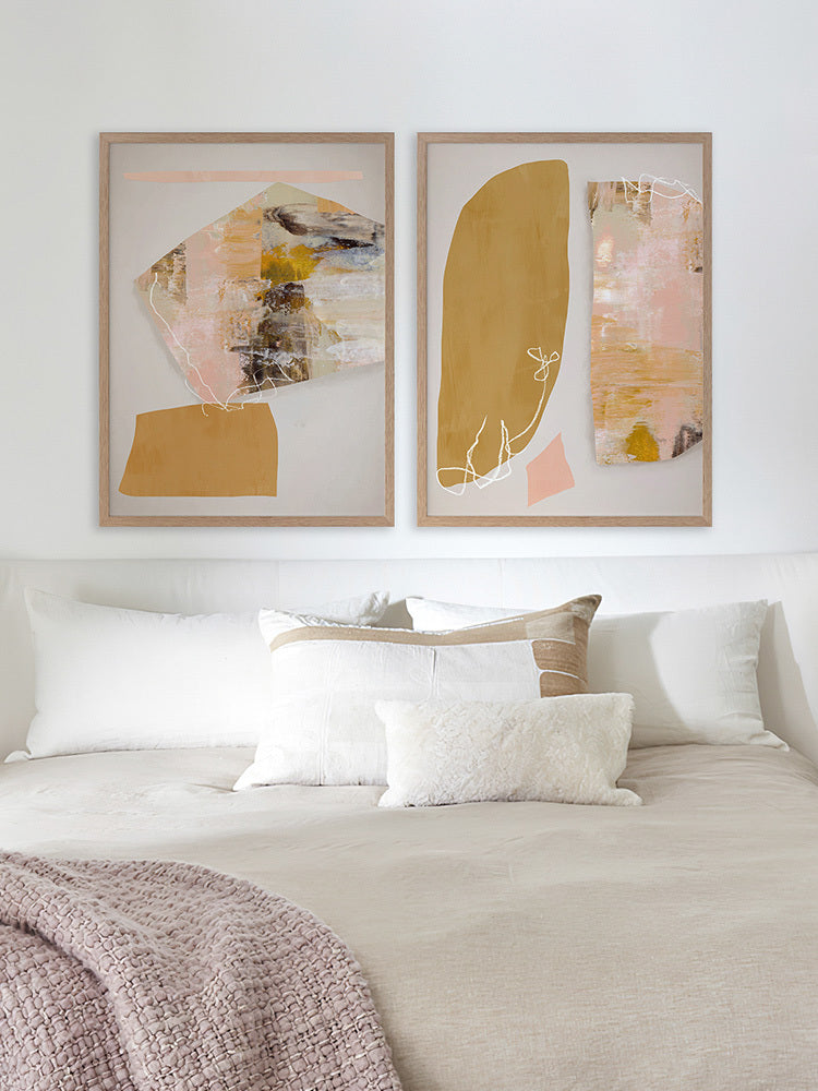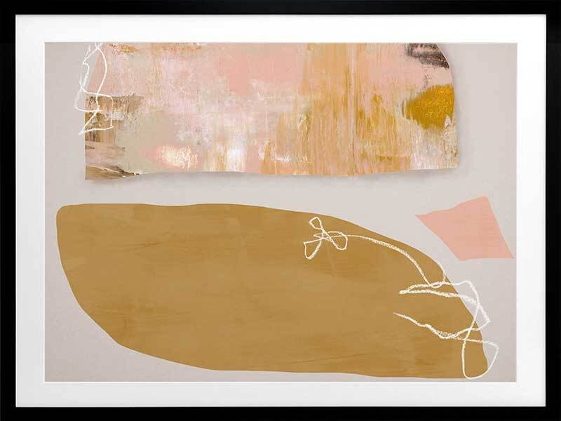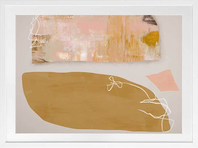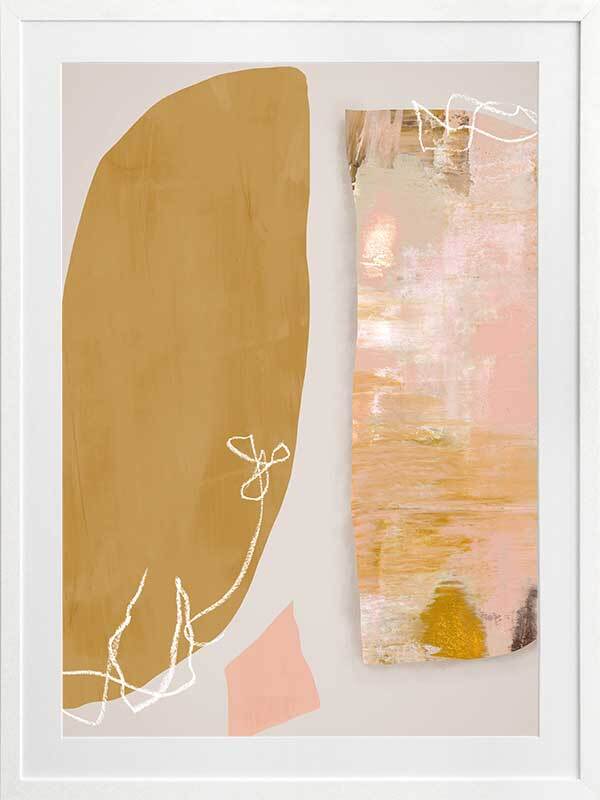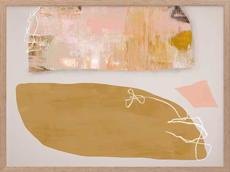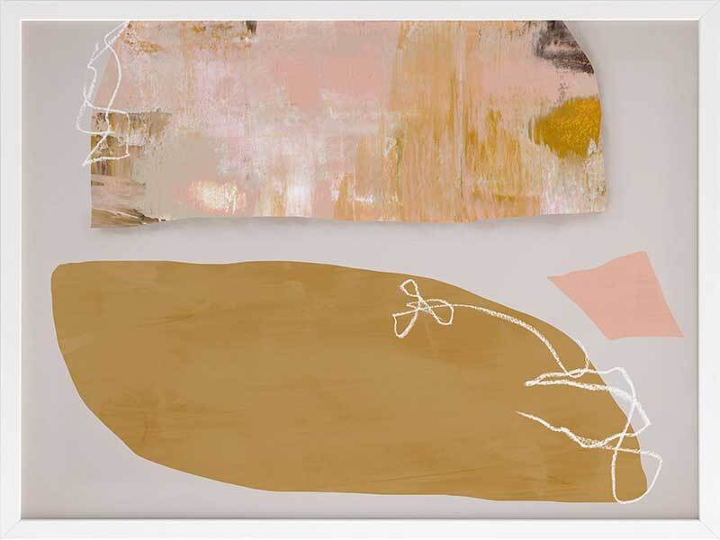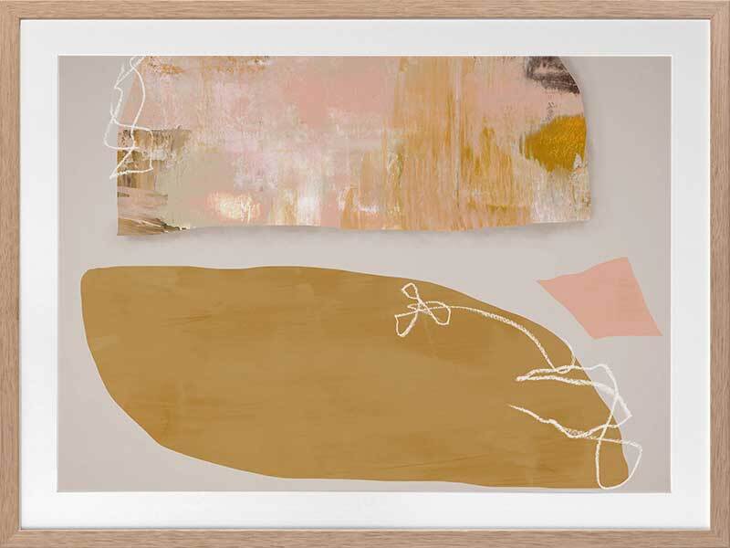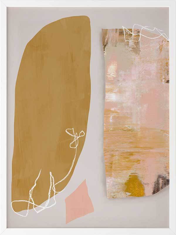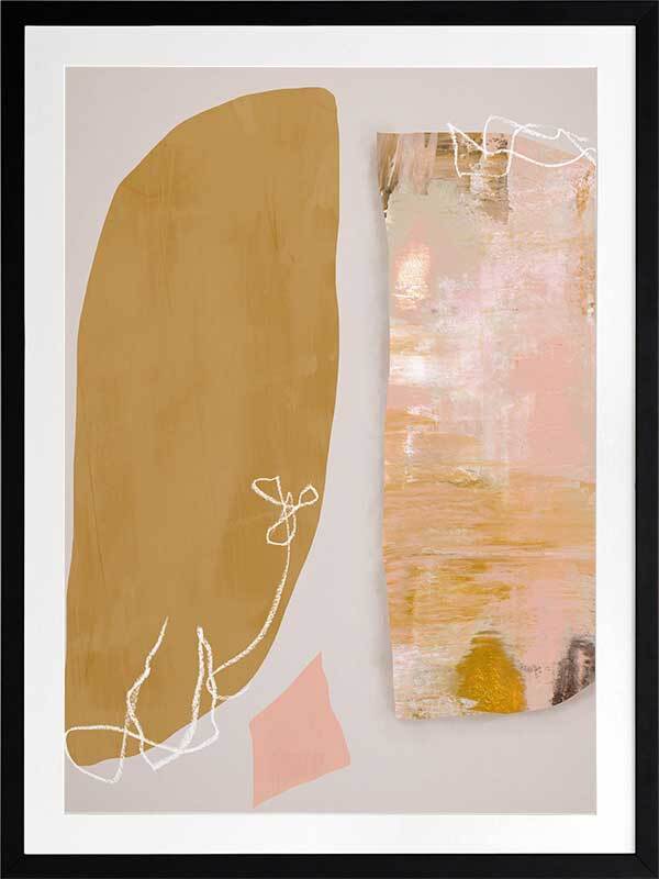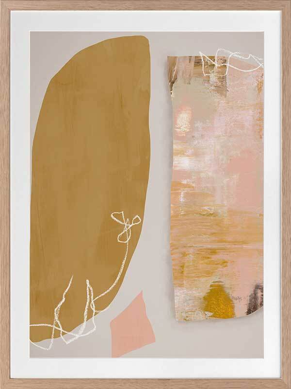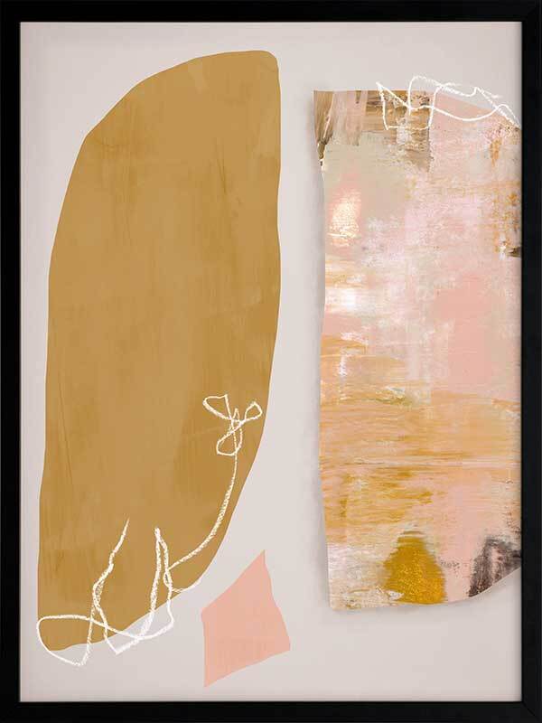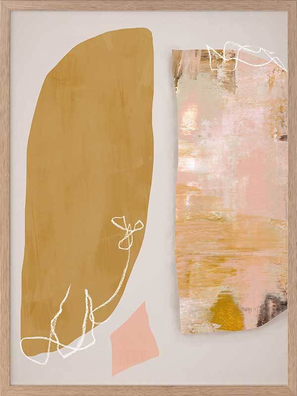 Nomad II Framed Print: A unique, textural abstract artwork featuring bold shapes and textures in a warm pink, beige and mustard colour palette. Pairs with Nomad I. 2020 AUTUMN/WINTER COLLECTION: REVERIE