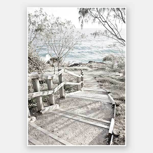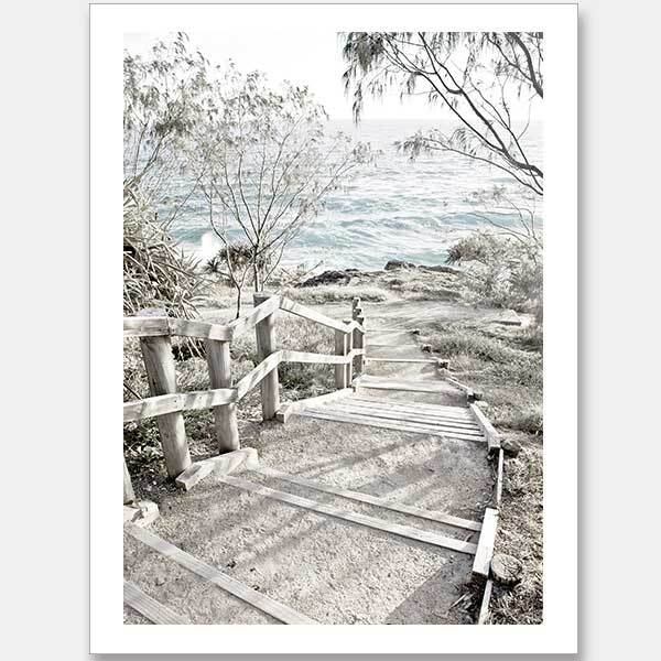 Ocean Alley - A set of wooden beach stairs leads down towards a rocky foreshore, where the ocean crashes against the land in this photographic artwork.
