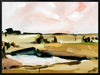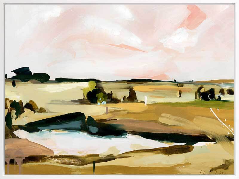 Ochre Fields Canvas Art Print - Perfect for an understated colour statement, this artwork brings an early sunrise to life, with a dreamy blush pink sky, watching over a quiet field, home to bushy trees and a small lake. Neutral khaki green, brown and mustard tones contrast beautifully with the pink sky.