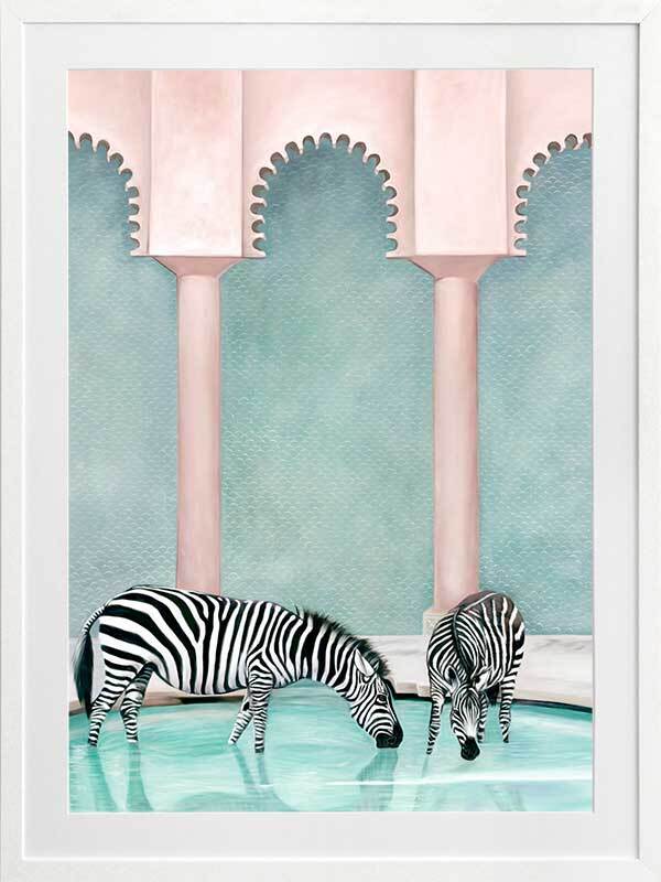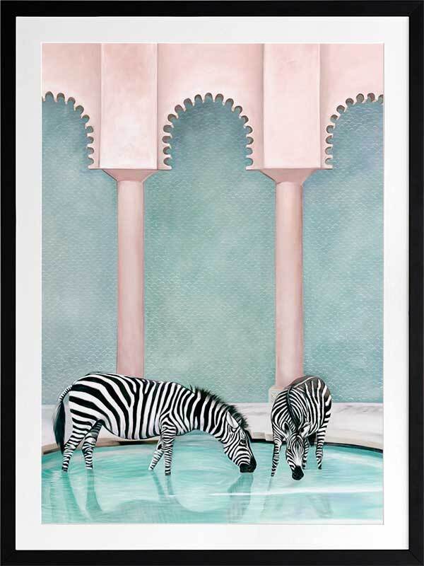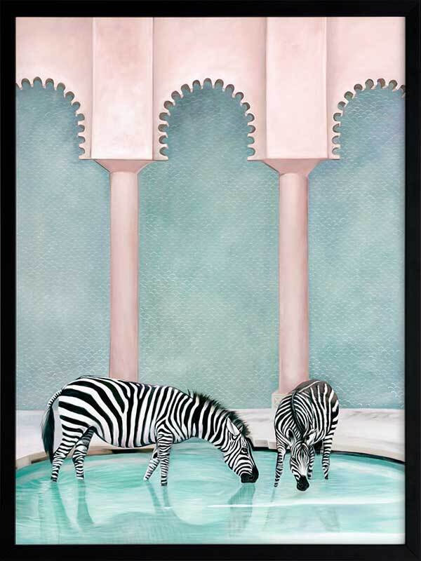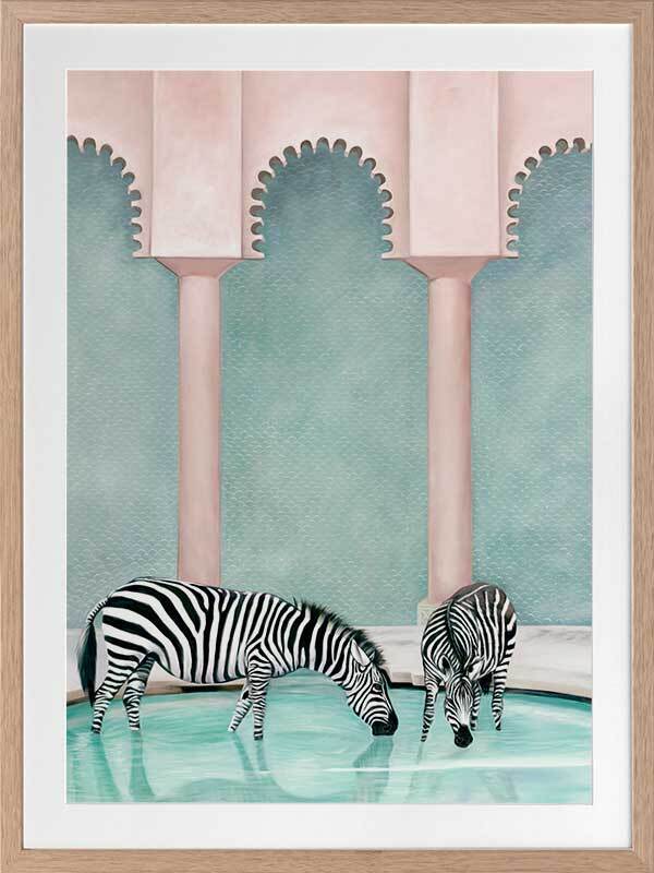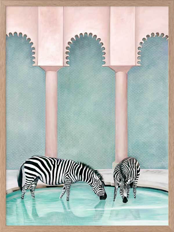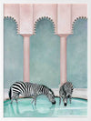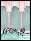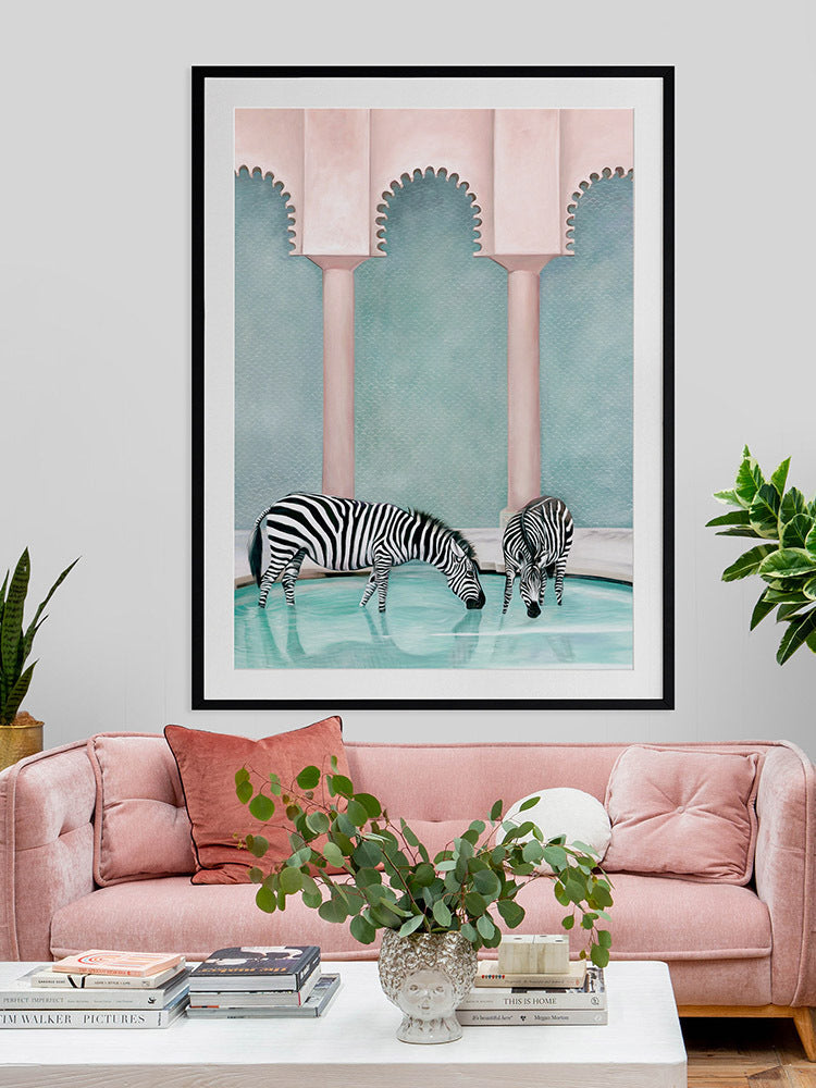 Office Gossip Framed Print: A whimsical art print that features two zebra drinking from a pool under a pastel pink archway in Morocco. 2020 AUTUMN/WINTER COLLECTION: REVERIE