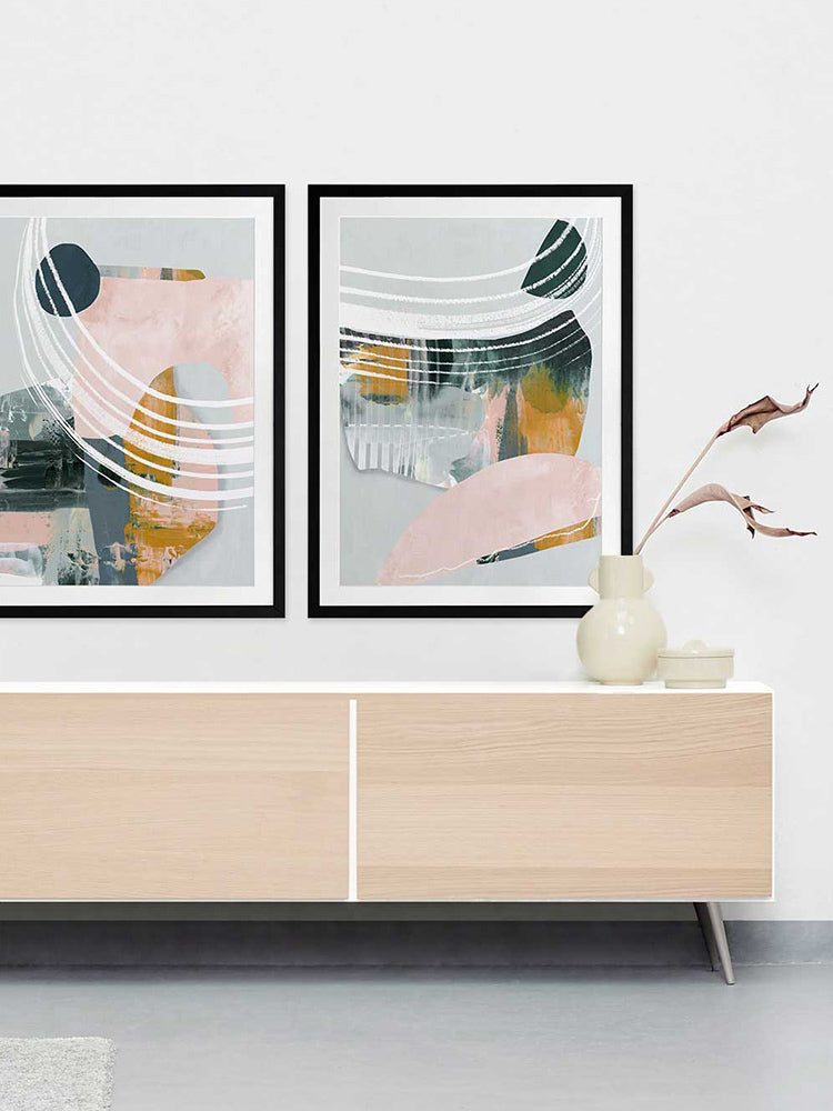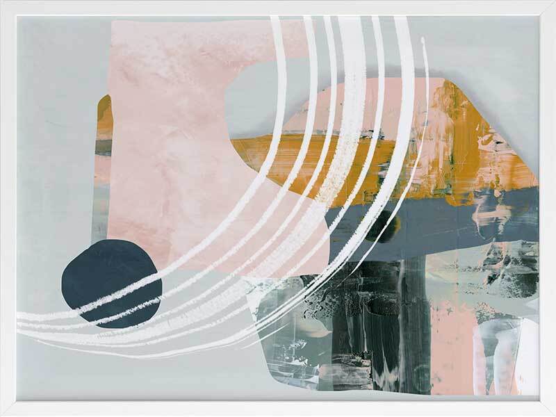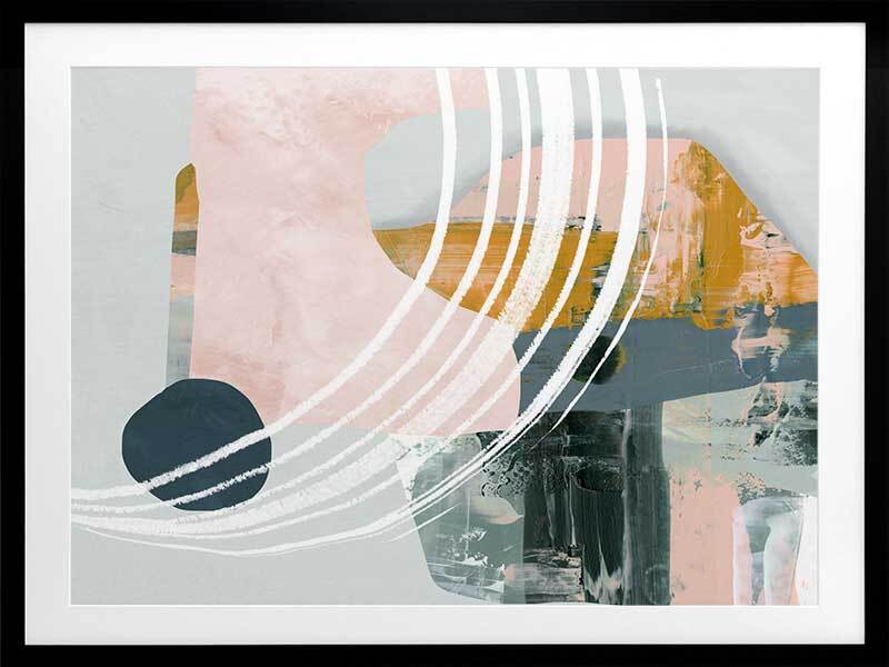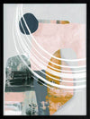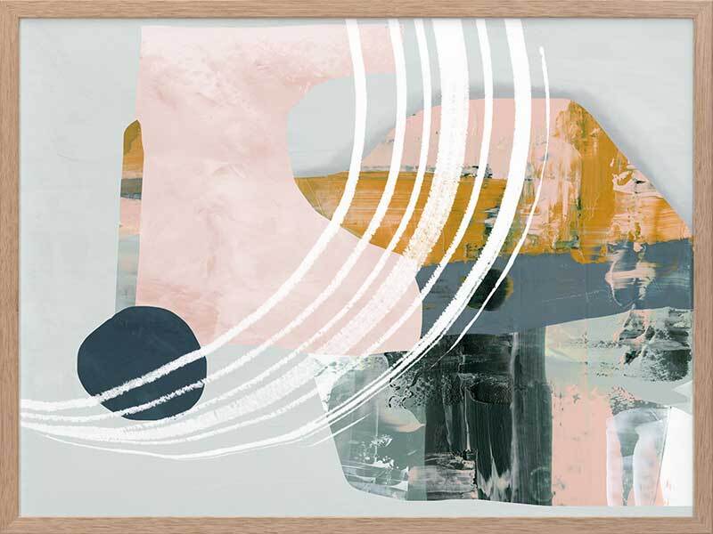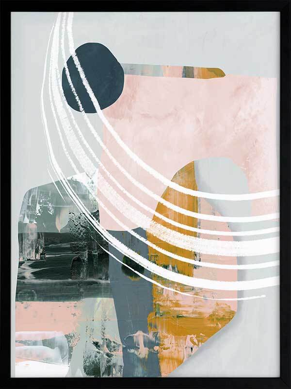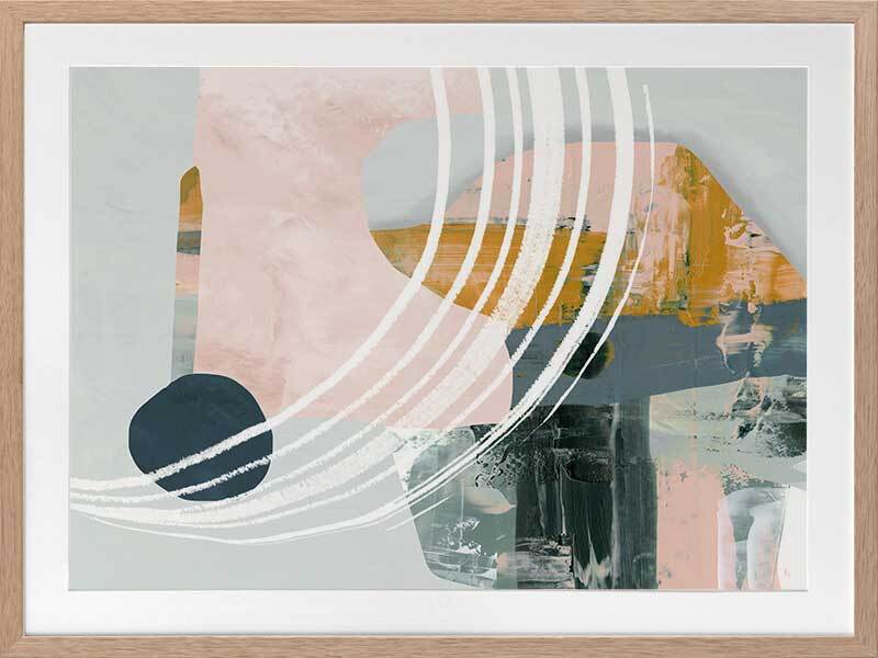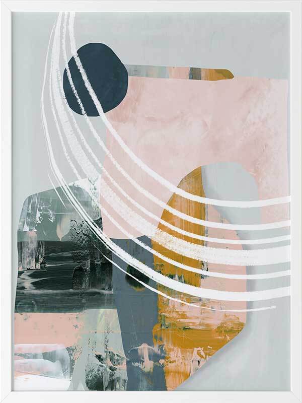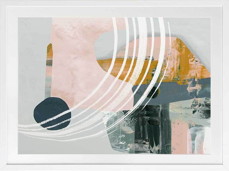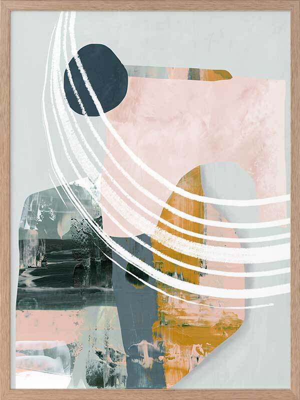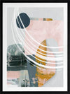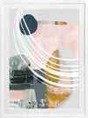 Opus I Framed Print: An abstract artwork that celebrates movement with overlapping shapes, washes and lines in a soft pink, mustard and blue colour palette. Pairs with Opus II. 2020 AUTUMN/WINTER COLLECTION: REVERIE