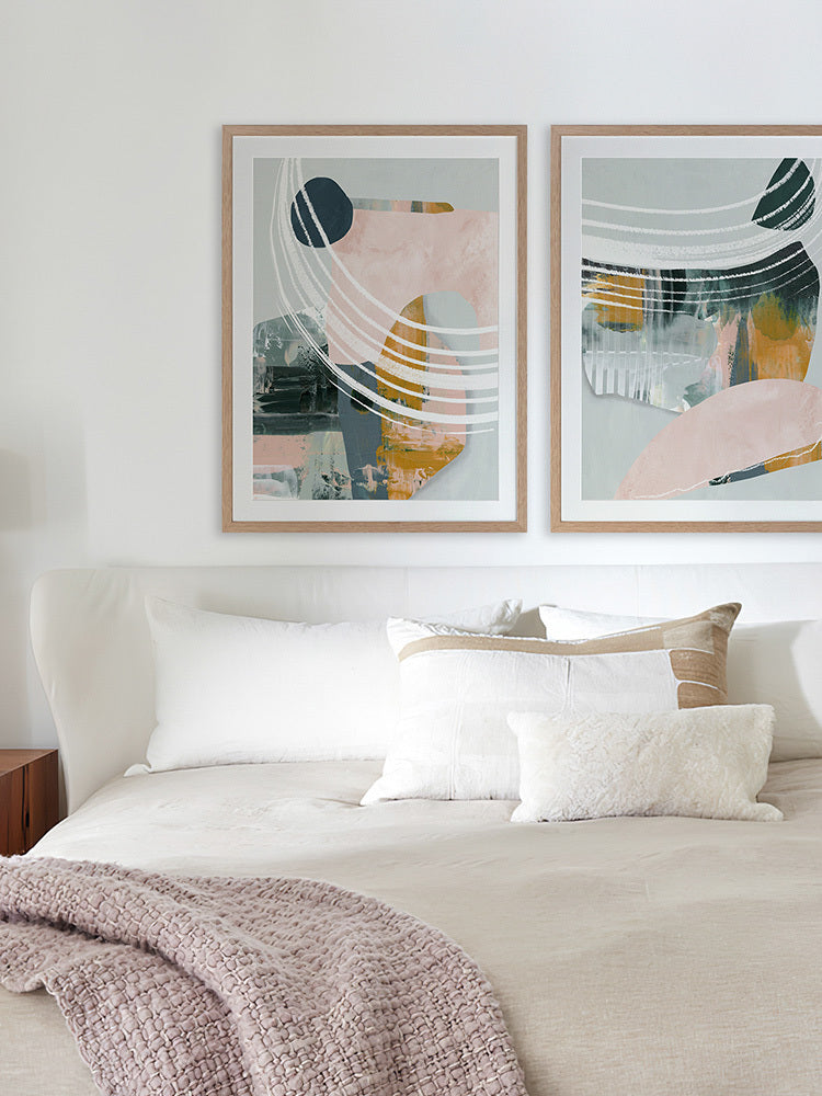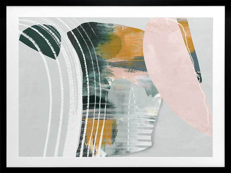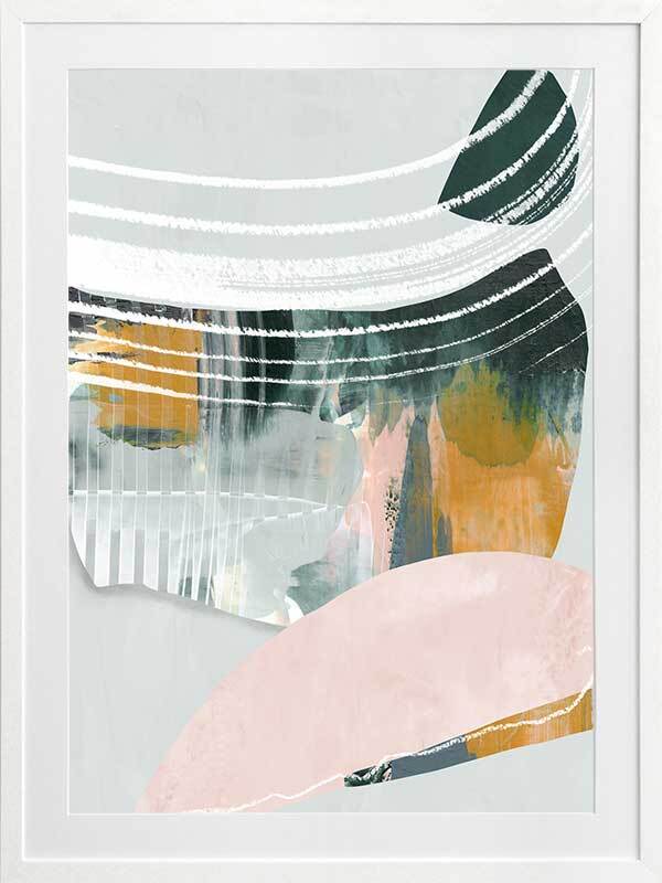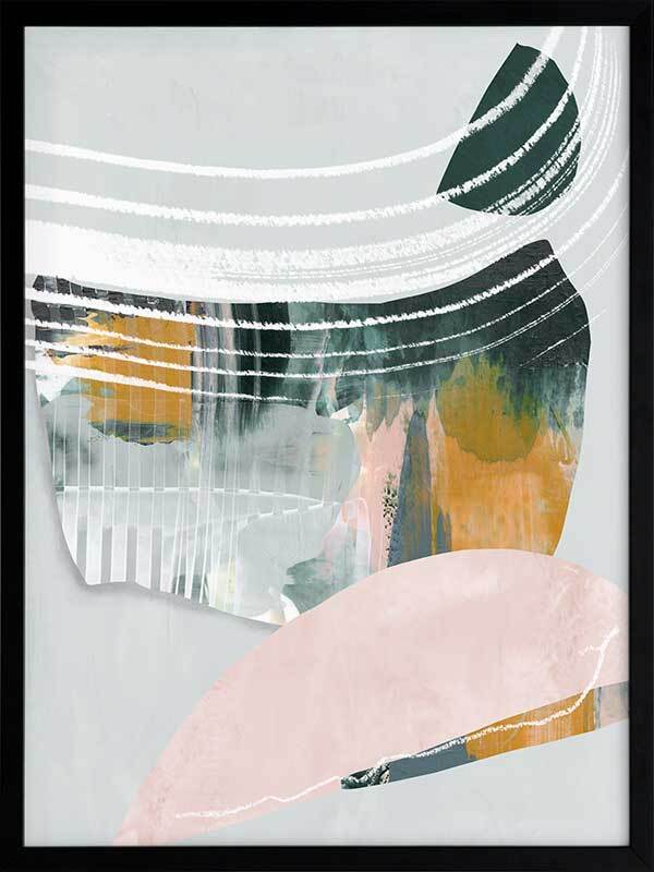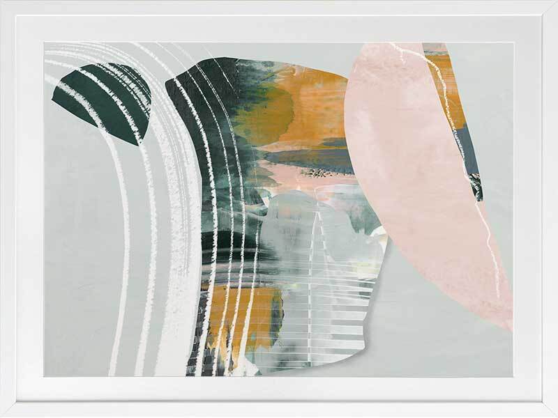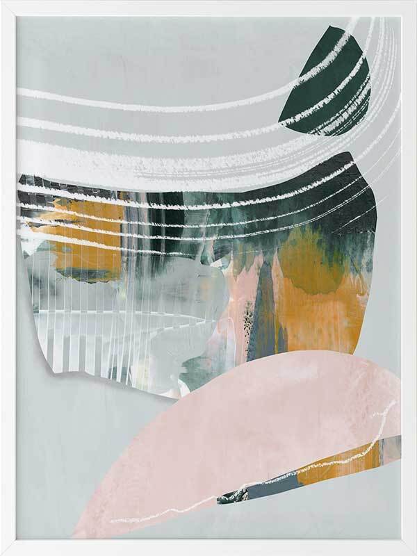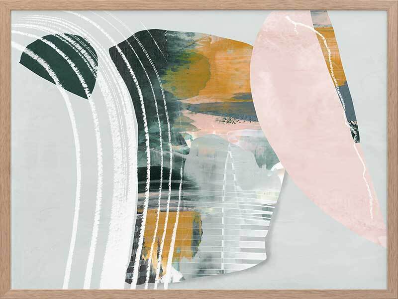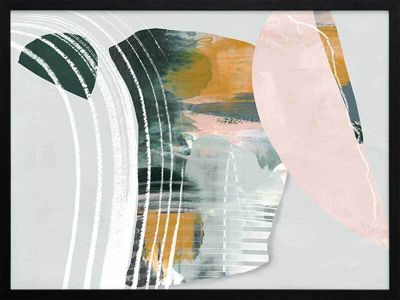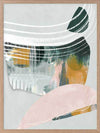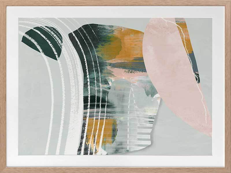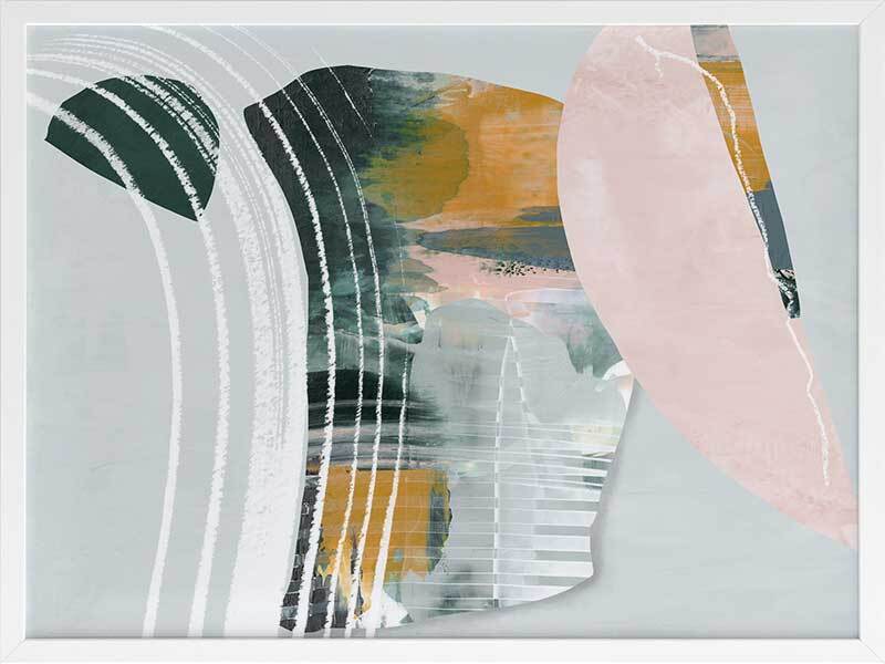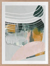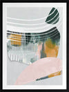 Opus II Framed Print: An abstract artwork that celebrates movement with overlapping shapes, washes and lines in a soft pink, mustard and blue colour palette. Pairs with Opus I. 2020 AUTUMN/WINTER COLLECTION: REVERIE