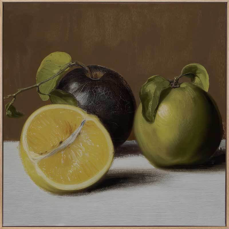 Orchard Canvas Art Print - Freshly picked from the local orchard, this detailed still life artwork by Darren Palmer brings vintage farmhouse vibes to your bedroom, living room, or kitchen. Featuring yellow, brown, and green hues, this art print brings a calming essence to any home decor.