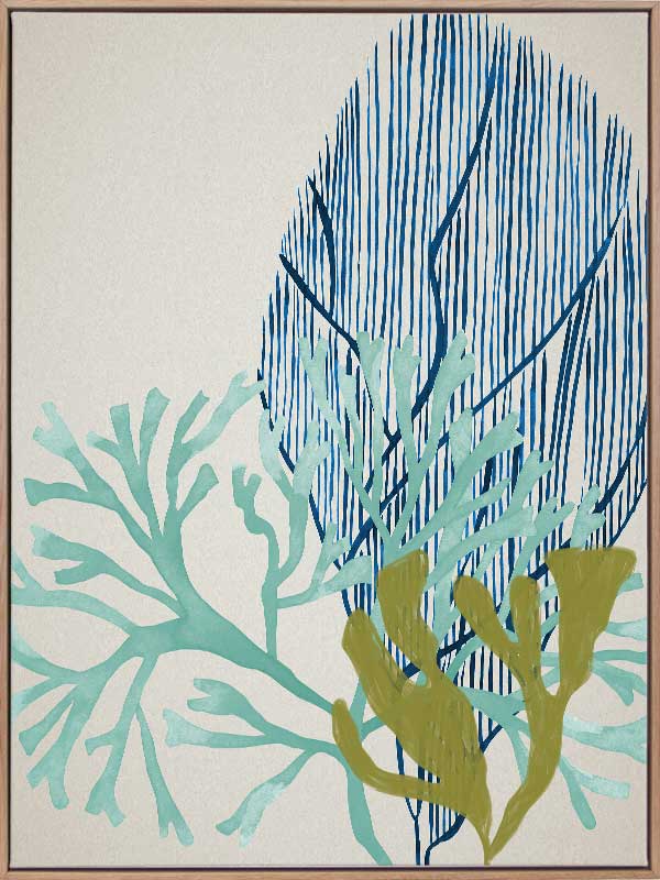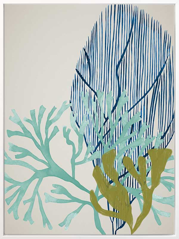 Osprey Reef - A Hampton's inspired artwork featuring overlapping watercolour painted coral in shades of green and blue on a beige background.
