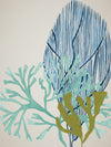Osprey Reef - A Hampton's inspired artwork featuring overlapping watercolour painted coral in shades of green and blue on a beige background.