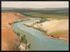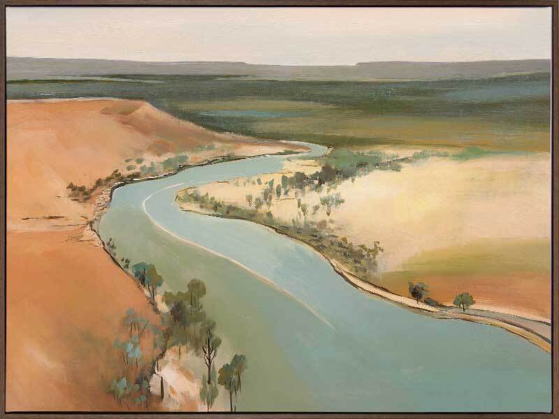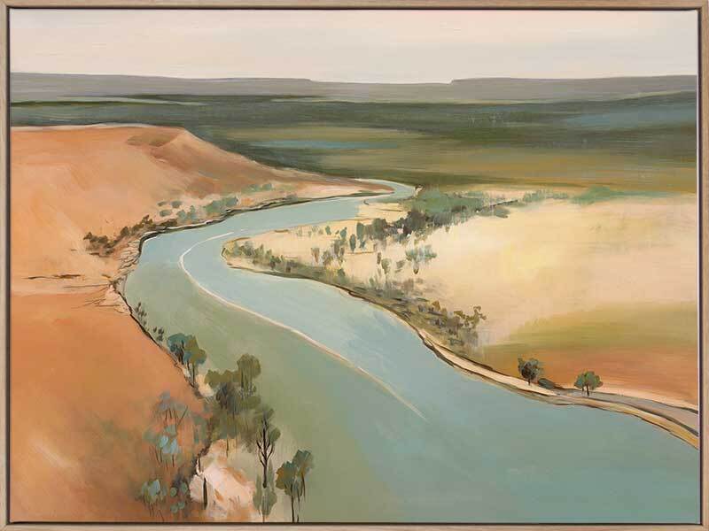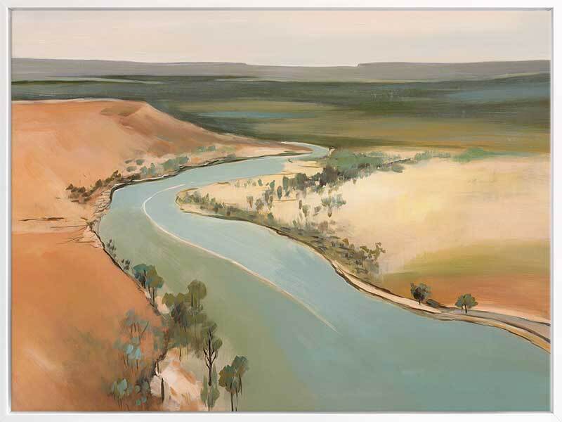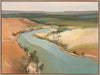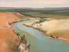 Outback Escapades Canvas Art Print - A winding lake, like a pathway to a place unknown, flows as it is nestled between the hot, orange sand - a symbol of the great Australian outback. This landscape artwork commands any space, with a soft palette of teal, green, warm brown, and grey.