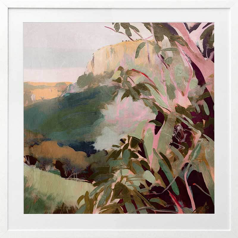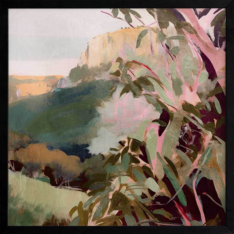 Outback Odyssey Framed Art Print - Whisk yourself off on a relaxing holiday in the Aussie outback with this gorgeous landscape art print, featuring a cliff and forestry in the distance. Palette includes soft shades of khaki green and brown, with pink highlights reminiscent of a warm summer sunset and its dreamy reflections. With its simple colours and soft, blended design, this modern art print is easy to incorporate with any interior style.