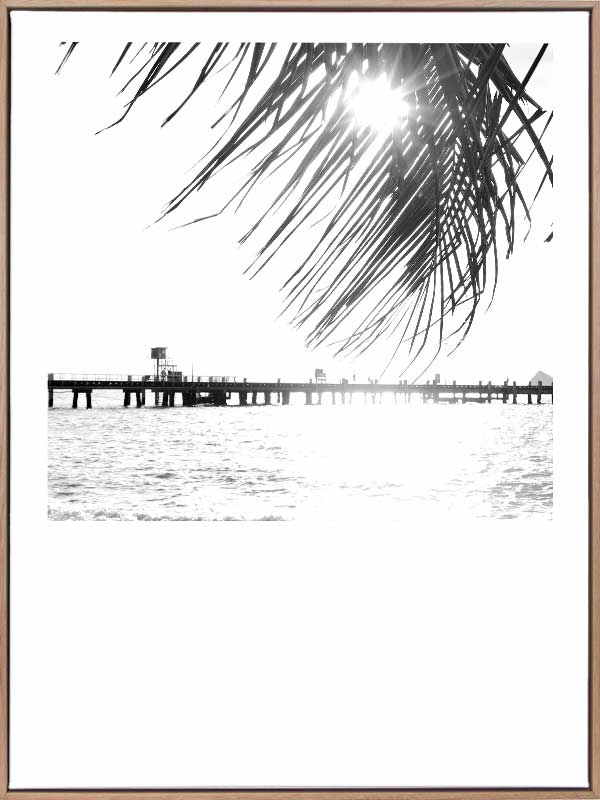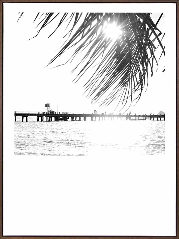 Palm Cove I Poster Print. This black and white photographic poster print of the pier at Palm Cove is a romantic image. You can imagine sitting underneath the shade of that palm frond and enjoying the relaxing atmosphere. Pair with Palm Cove II.