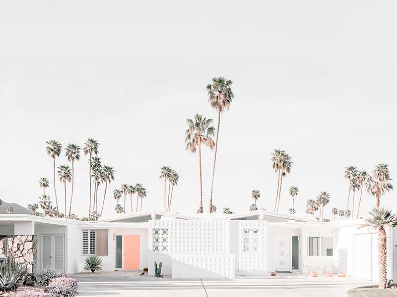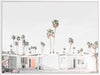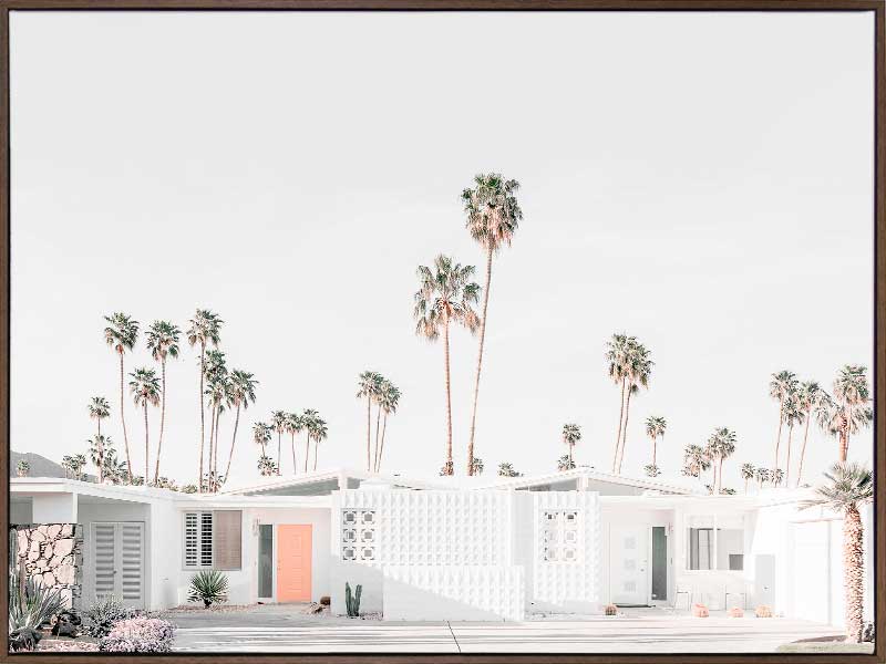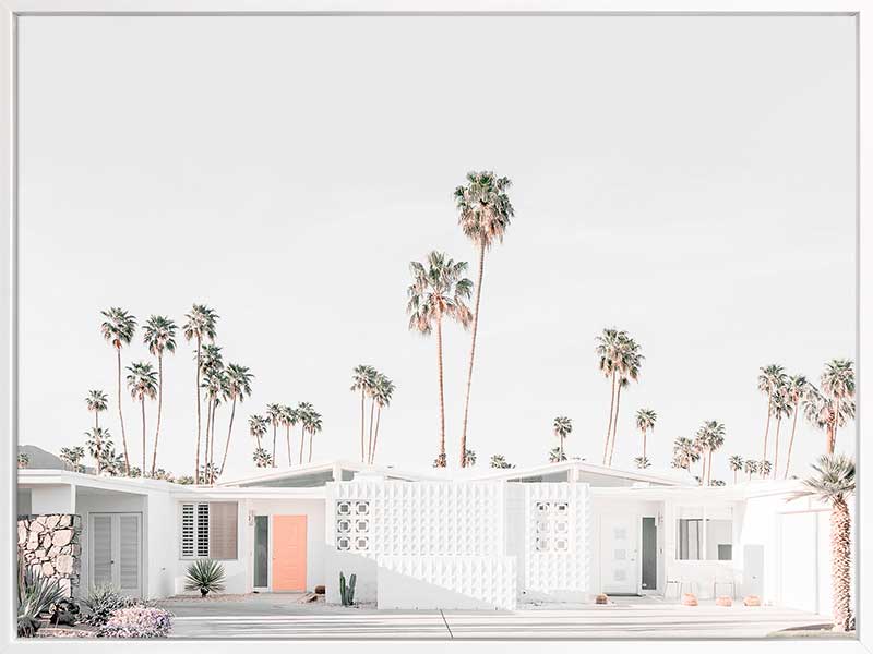 Palm Springs House Poster Print. This photographic art piece is inviting back to the seventies with the crisp white walls of the house exterior punctuated by the peach entrance door. The surrounding landscape is dotted with commanding palm trees reaching up to the empty sky.