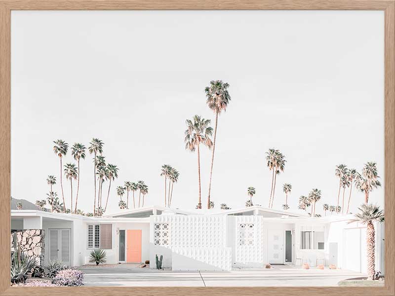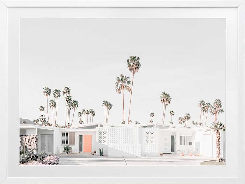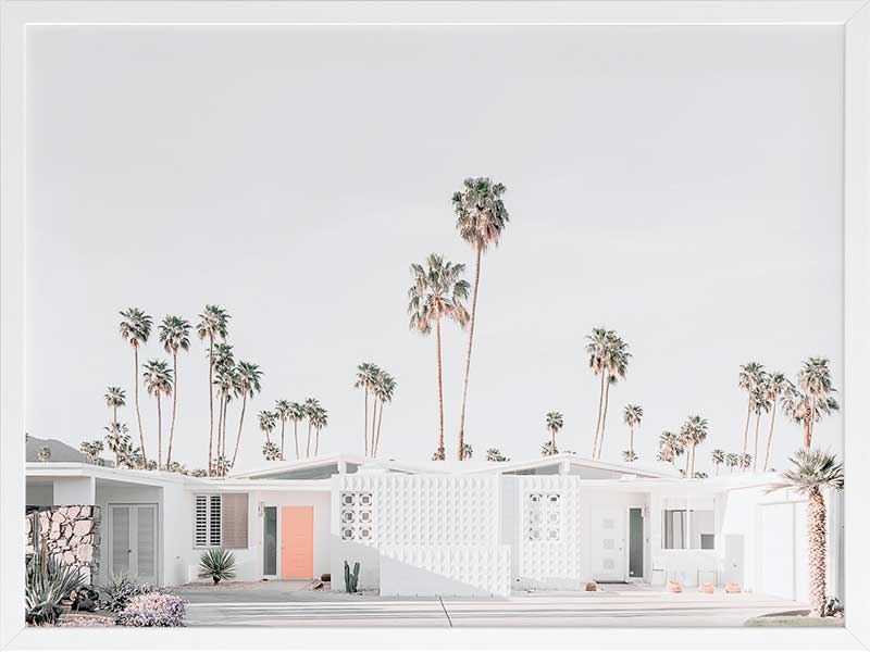 Palm Springs House Poster Print. This photographic art piece is inviting back to the seventies with the crisp white walls of the house exterior punctuated by the peach entrance door. The surrounding landscape is dotted with commanding palm trees reaching up to the empty sky.