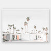 Palm Springs House Poster Print. This photographic art piece is inviting back to the seventies with the crisp white walls of the house exterior punctuated by the peach entrance door. The surrounding landscape is dotted with commanding palm trees reaching up to the empty sky.