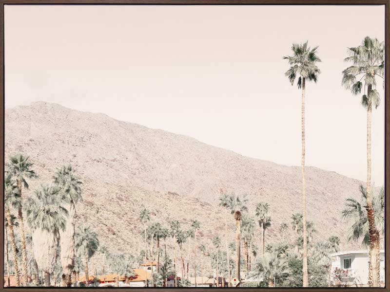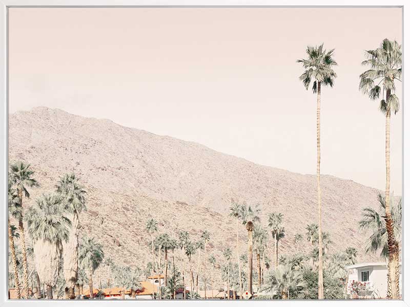 Palm Springs I Poster Print. This photographic art piece is full of tropical holiday memories in your space with the beautiful palm trees and mountain in the background. The soft pastel colours compliment any colour scheme in your space. Pairs with Palm Springs II Poster Print.