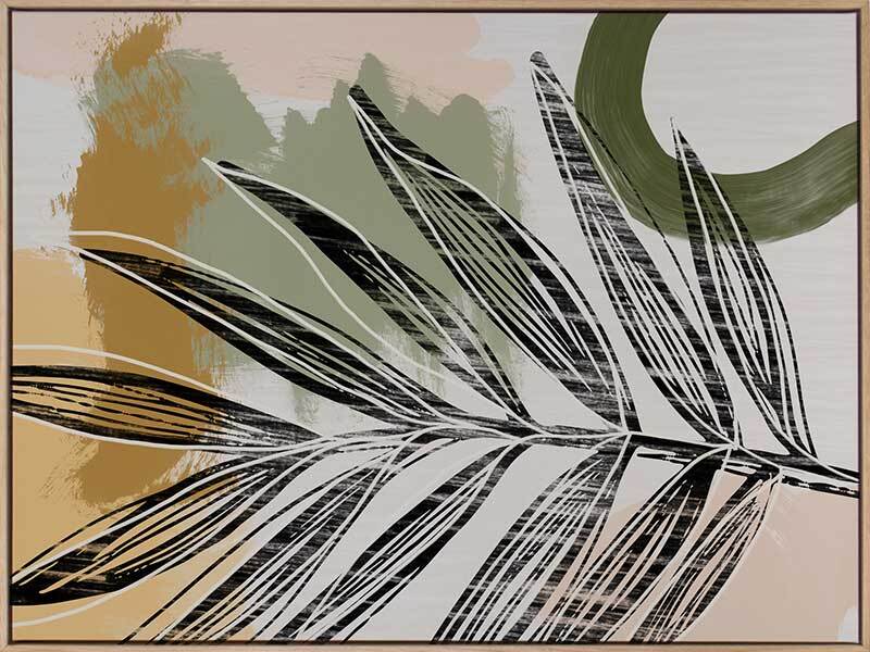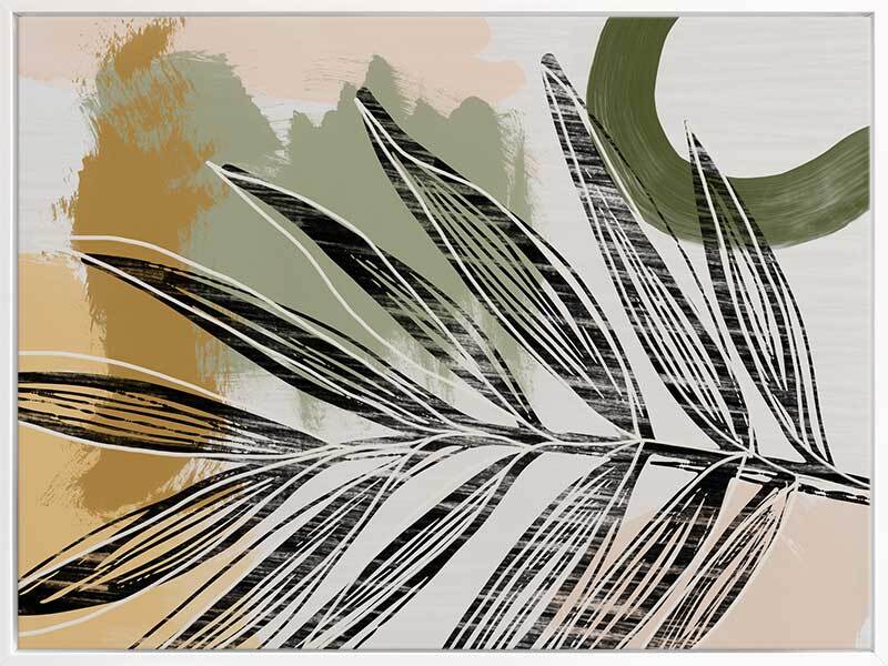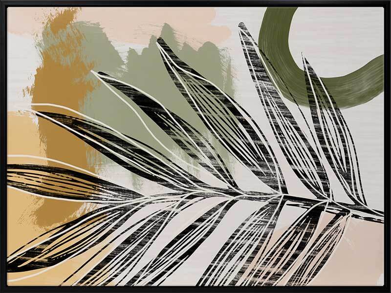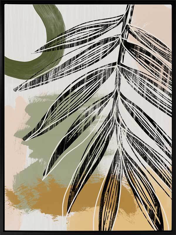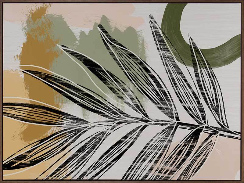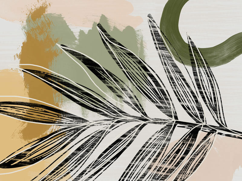 Palmier II Canvas Art Print: A fresh, earthy artwork that features a sketched, distressed leaf silhouette overlaying sage, green, mustard and peach shapes and strokes. Pairs with Palmier I. 2019 AUTUMN/WINTER COLLECTION: ODYSSEY