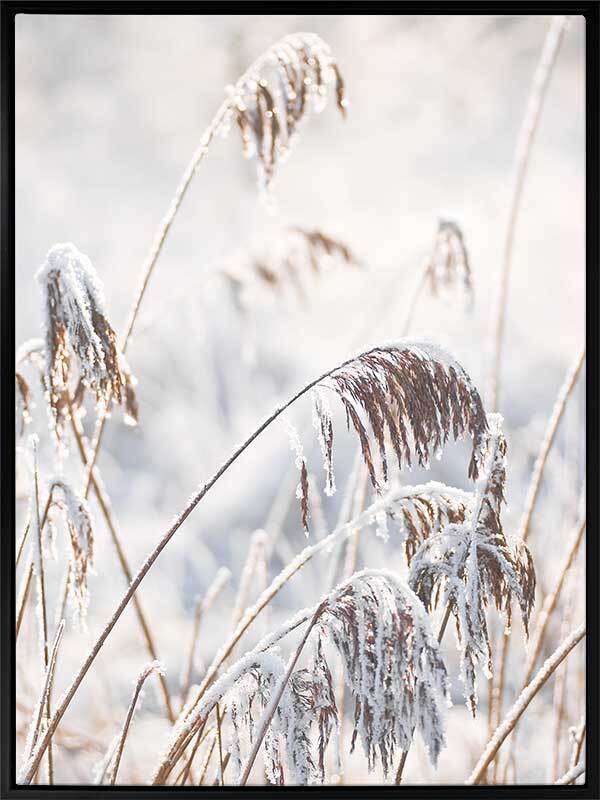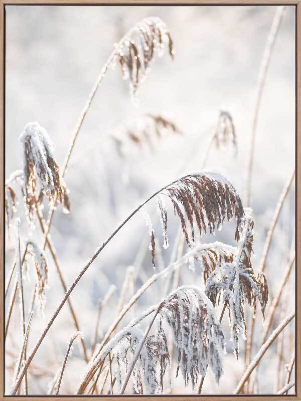 Pampas Frost Canvas Art Print - A serene photographic artwork featuring a soft-focus closeup of pampas style grass covered in frost. The colour palette is gentle and cool, featuring grey, beige and white tones. Pairs with Thistle Frost.
