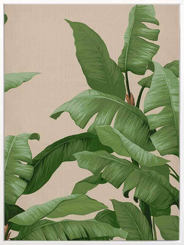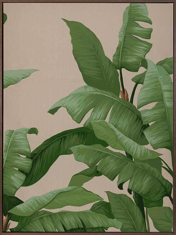Panama III Canvas Art Print: Part three of a tropical inspired mural piece featuring lush, green banana palms on a warm nude backdrop. Designed to be displayed as a triptych with Panama I & II. 2018 AUTUMN/WINTER COLLECTION: CONTINUUM