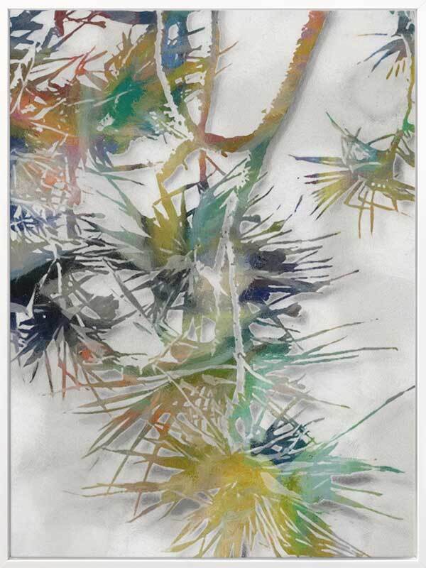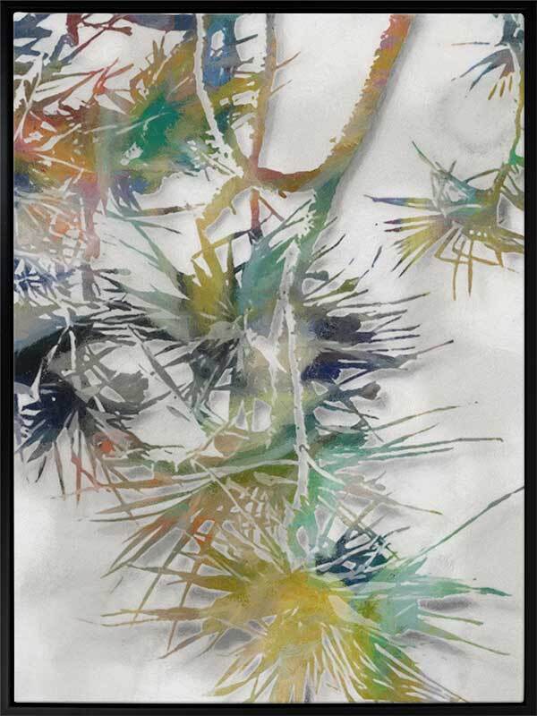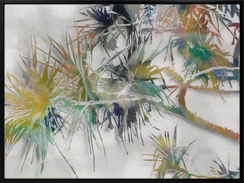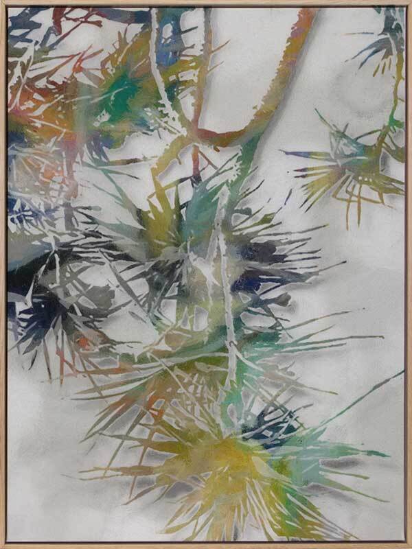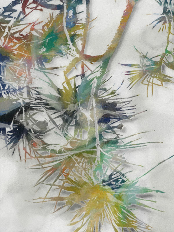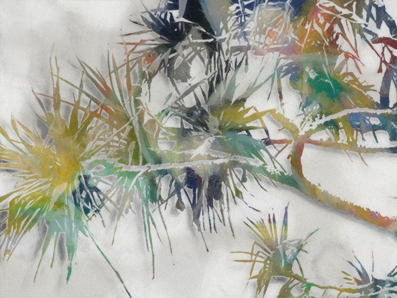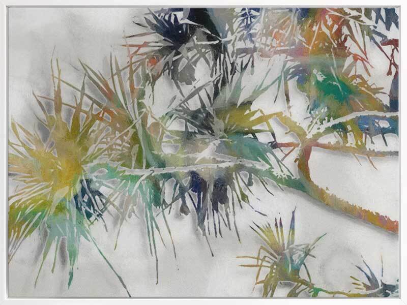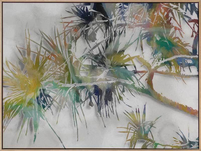 Pandan Beach Canvas Art Print: A painterly style pandanus tree in shades of green, blue, brown and yellow on a grey background, and overlayed with a distressed texture. 2019 AUTUMN/WINTER COLLECTION: ODYSSEY