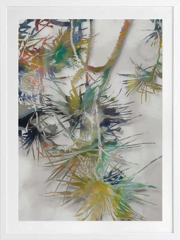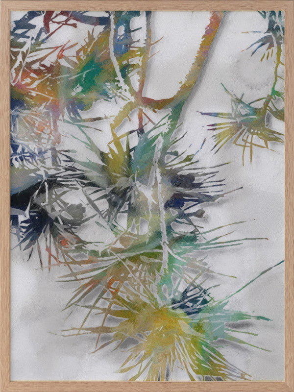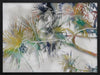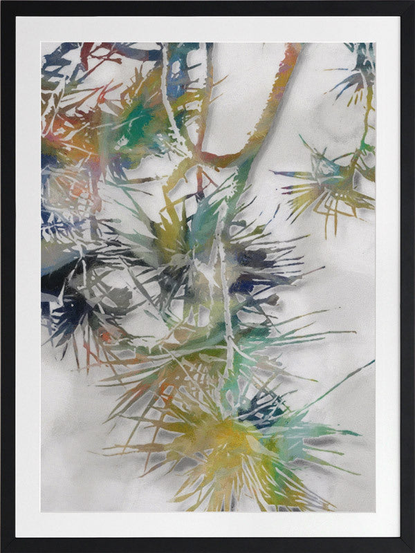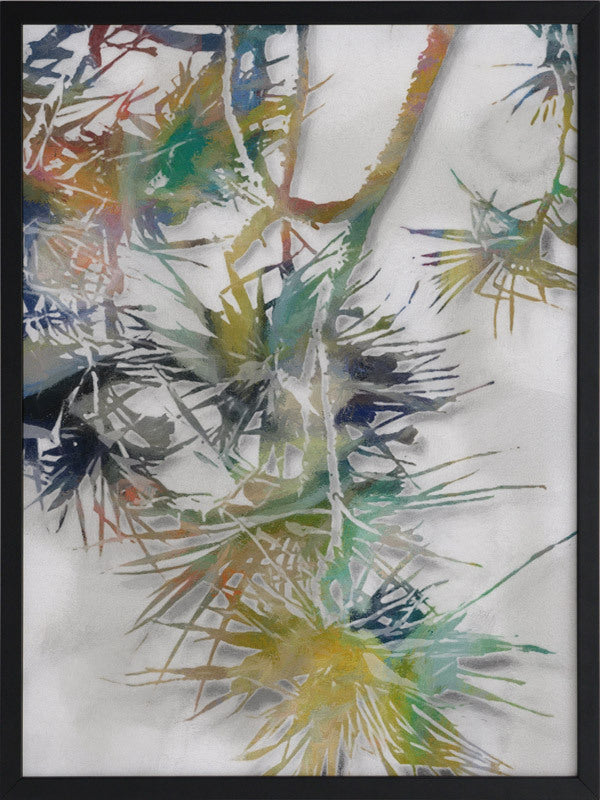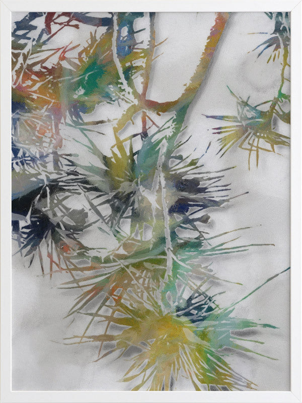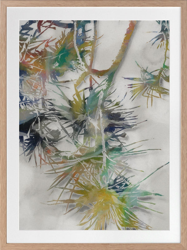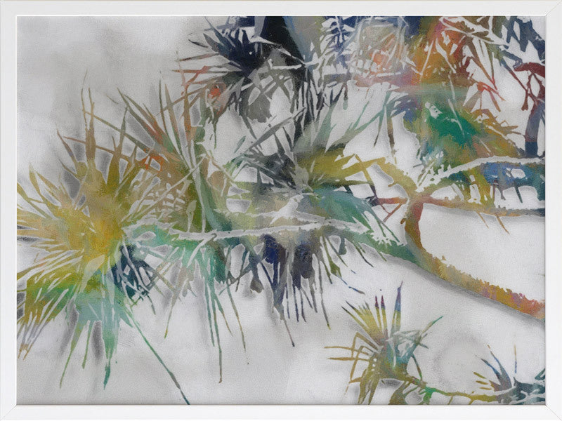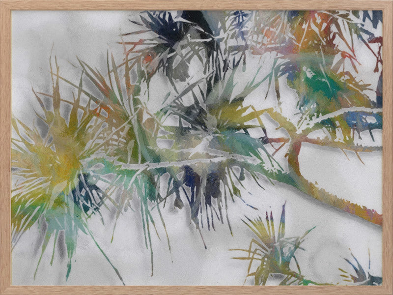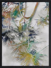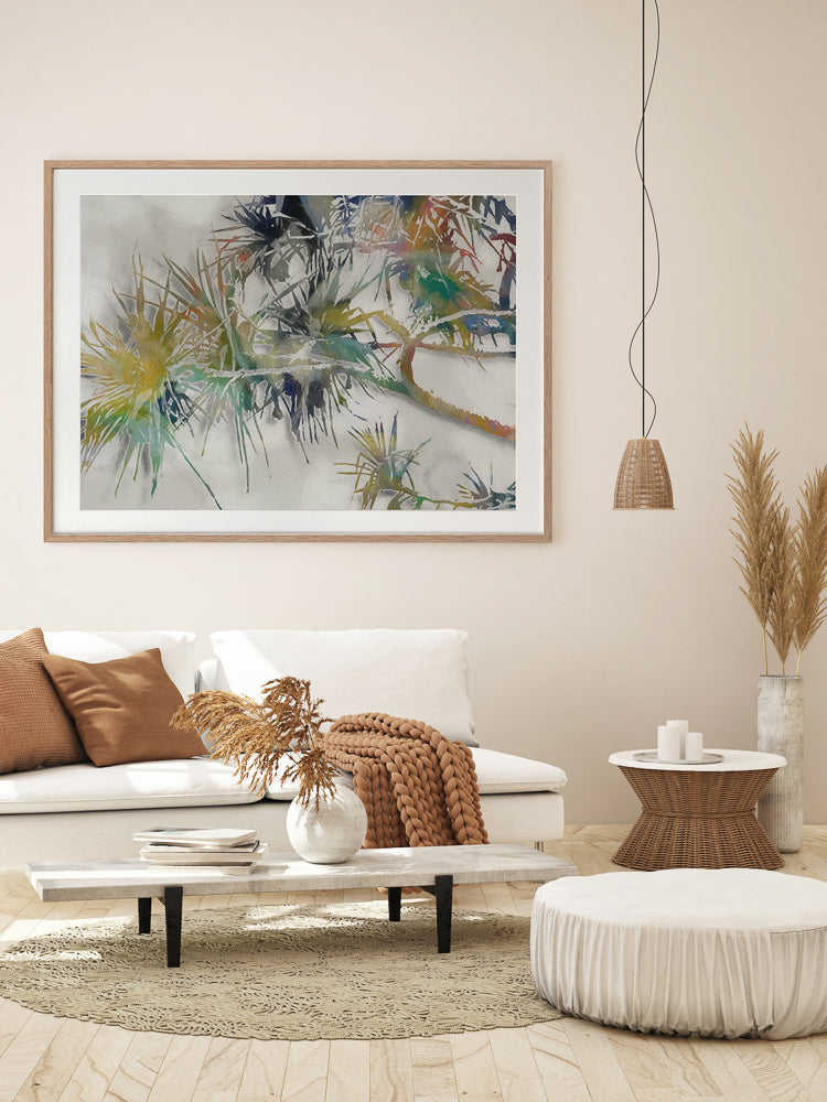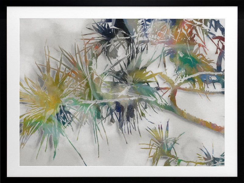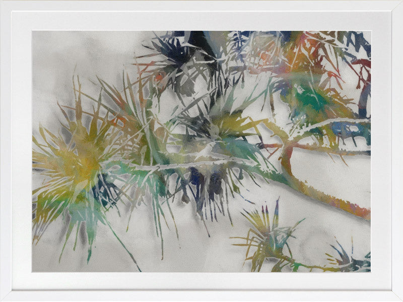 Pandan Beach Framed Print: A painterly style pandanus tree in shades of green, blue, brown and yellow on a grey background, and overlayed with a distressed texture. 2019 AUTUMN/WINTER COLLECTION: ODYSSEY