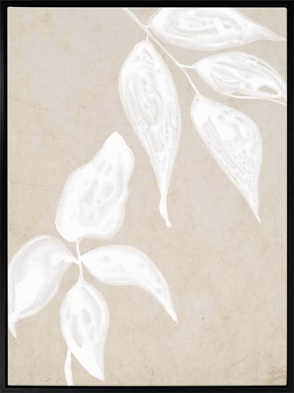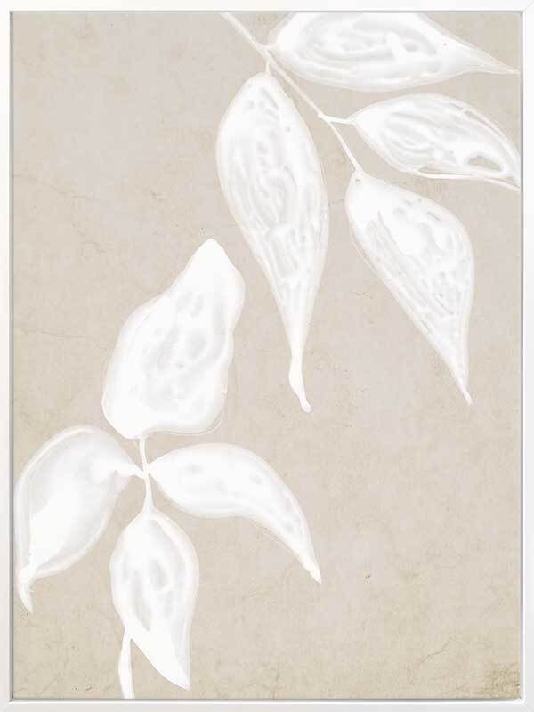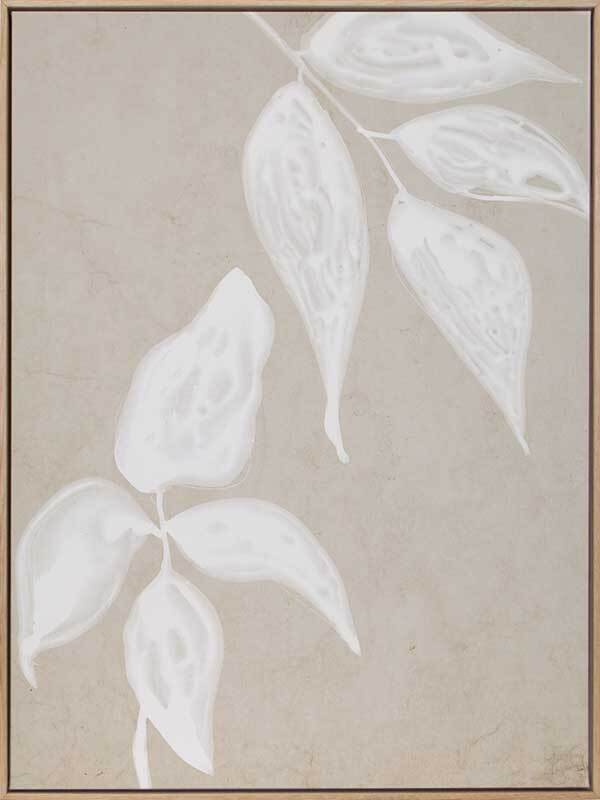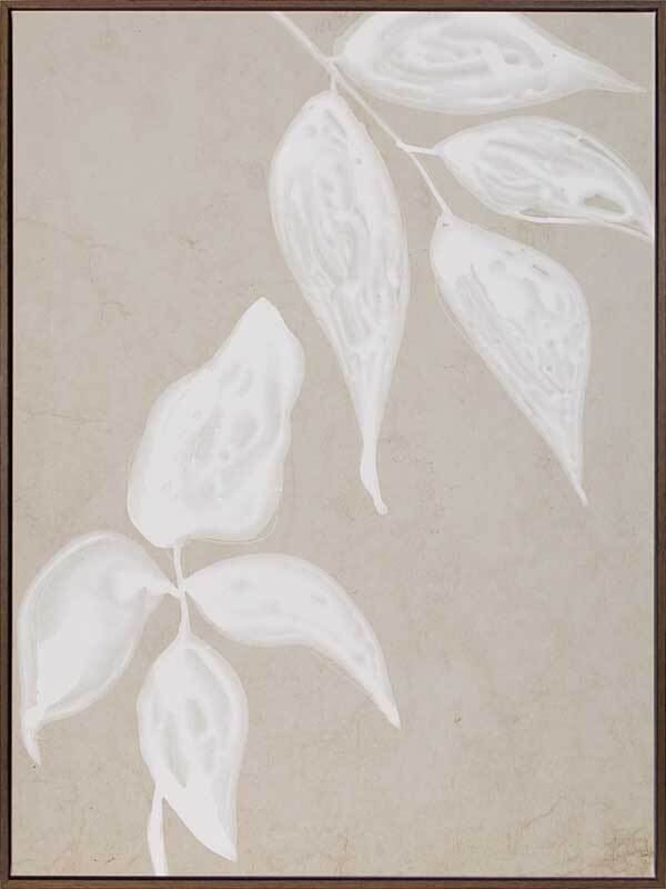 Paper Bark I Canvas Art Print: A soft, neutral artwork that features a white ink monoprint of a leaf on a parchment style background. Pairs with Paper Bark II & III. 2019 AUTUMN/WINTER COLLECTION: ODYSSEY