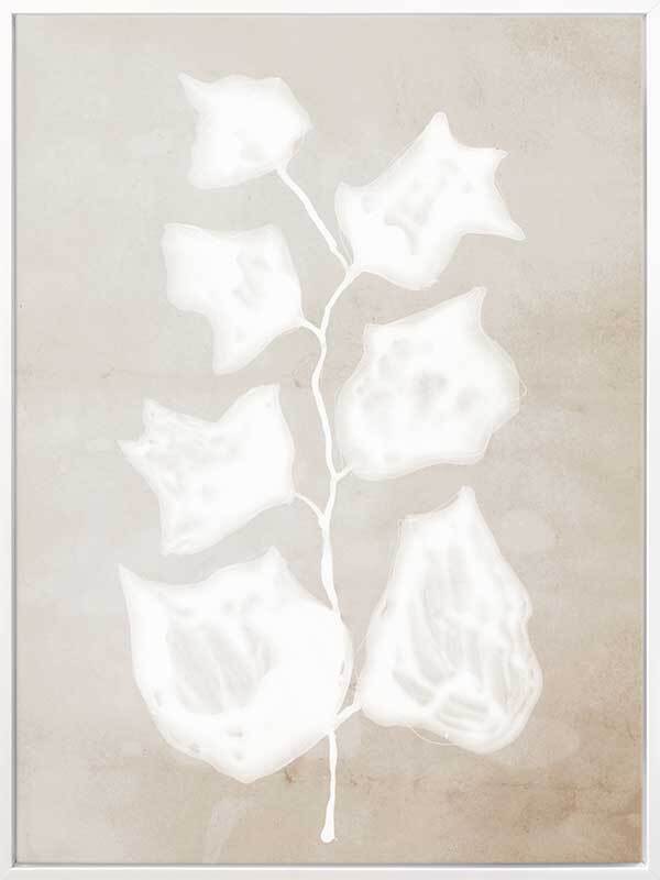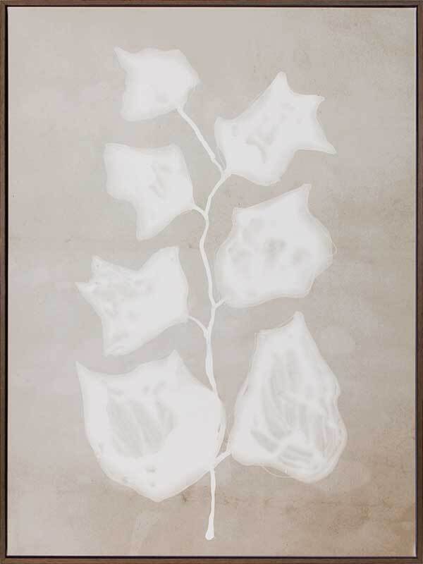 Paper Bark II Canvas Art Print: A soft, neutral artwork that features a white ink monoprint of a leaf on a parchment style background. Pairs with Paper Bark I & III. 2019 AUTUMN/WINTER COLLECTION: ODYSSEY