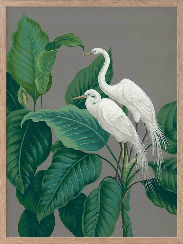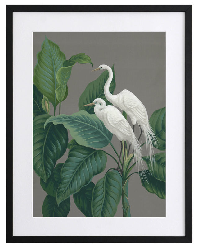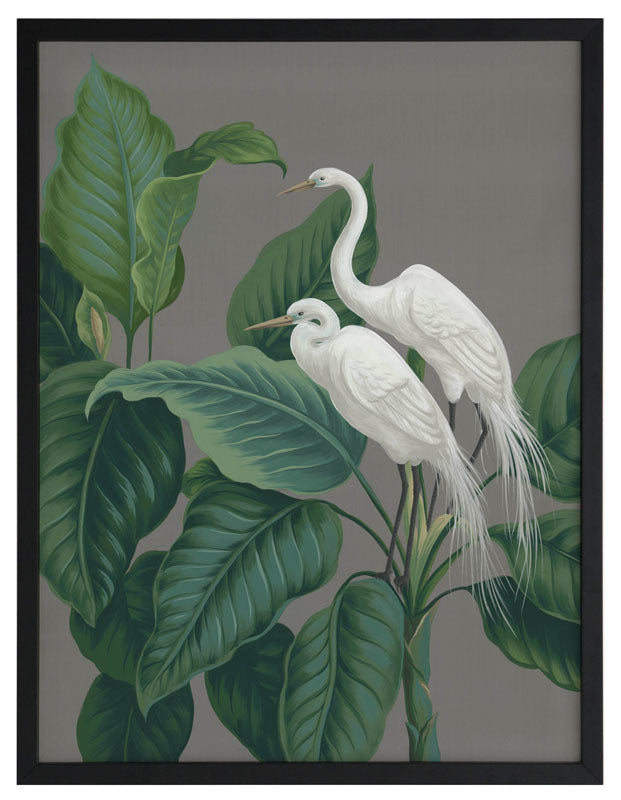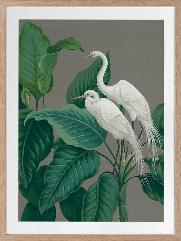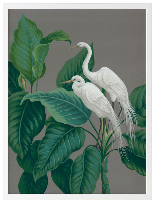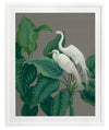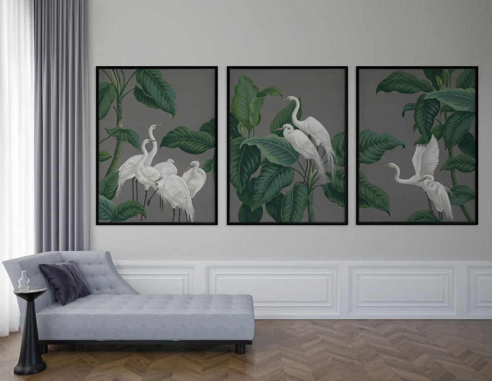 Paper Crane II Framed Print: Part two of an Oriental wetlands inspired mural piece featuring lush, green foliage and groups of beautiful white cranes on a grey background. Designed to be displayed as a triptych with Paper Crane I & III. 2018 AUTUMN/WINTER COLLECTION: CONTINUUM