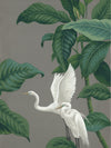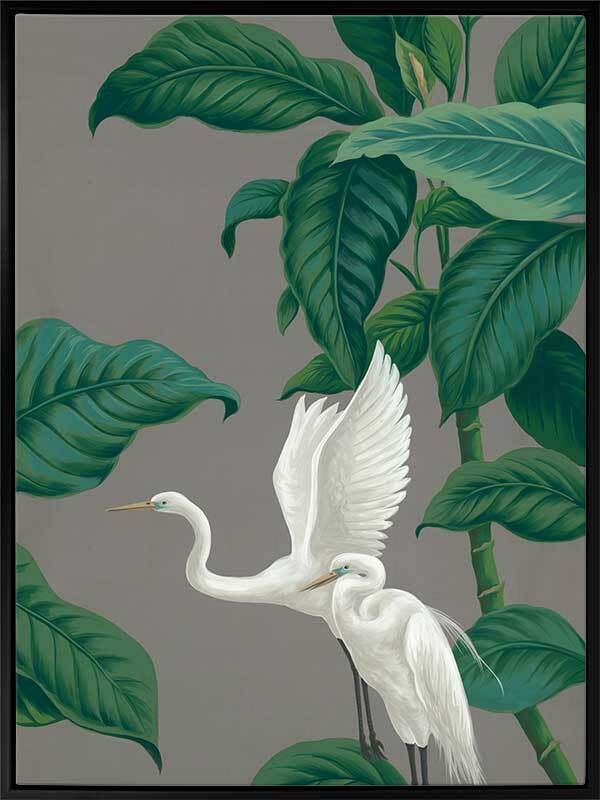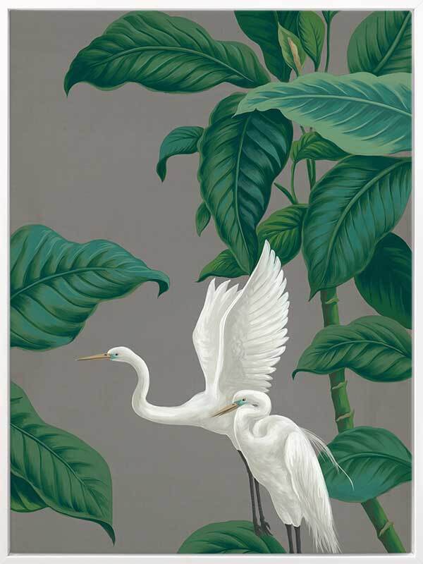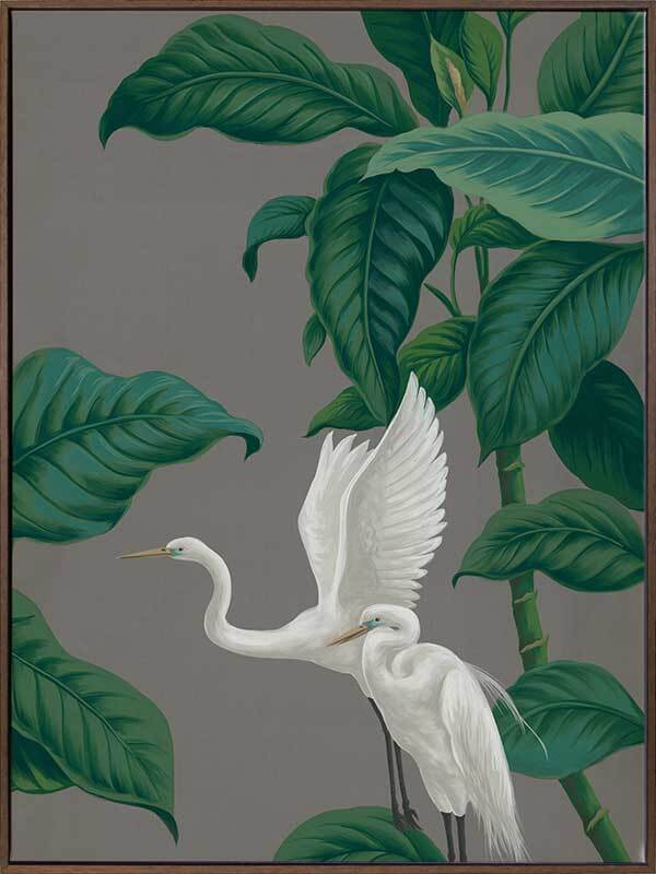 Paper Crane III Canvas Art Print: Part three of an Oriental wetlands inspired mural piece featuring lush, green foliage and groups of beautiful white cranes on a grey background. Designed to be displayed as a triptych with Paper Crane I & II. 2018 AUTUMN/WINTER COLLECTION: CONTINUUM