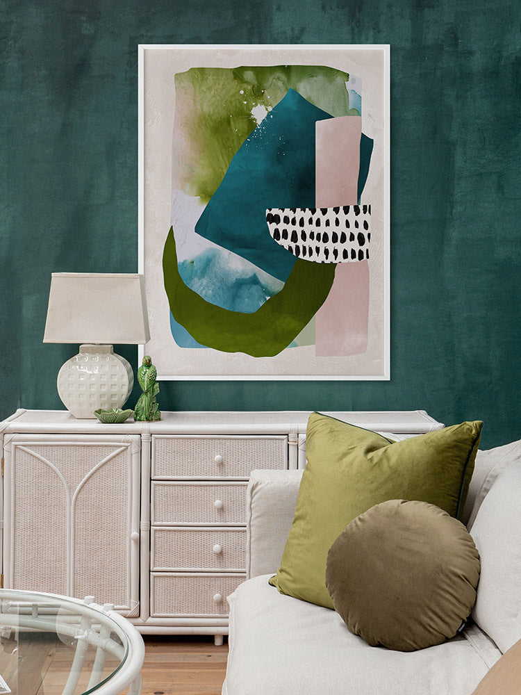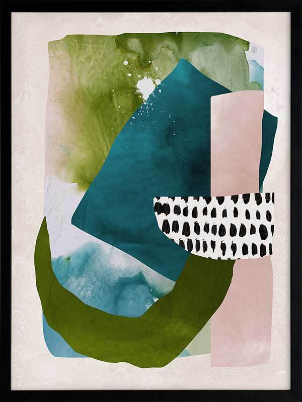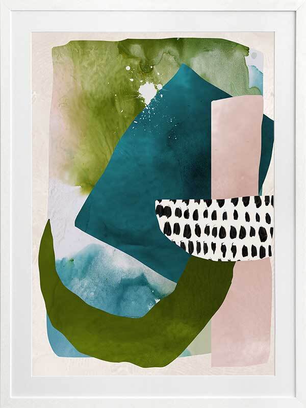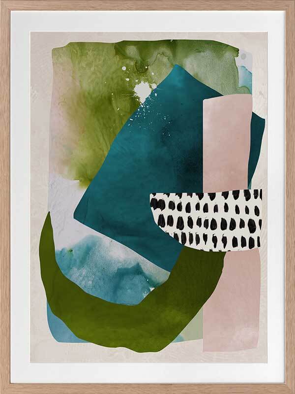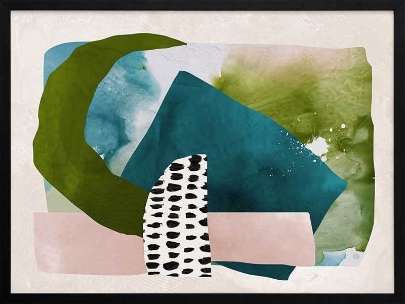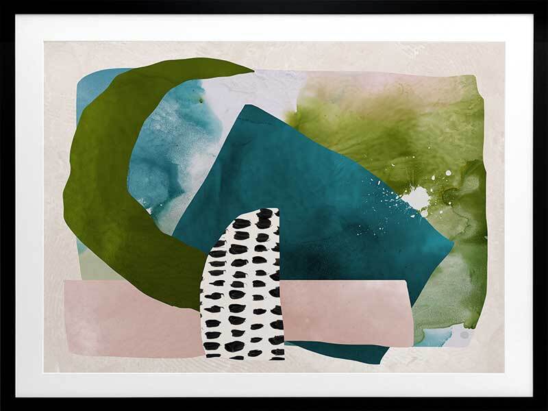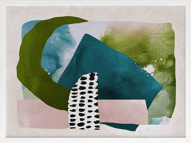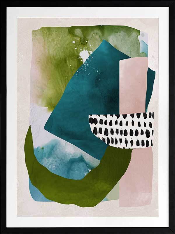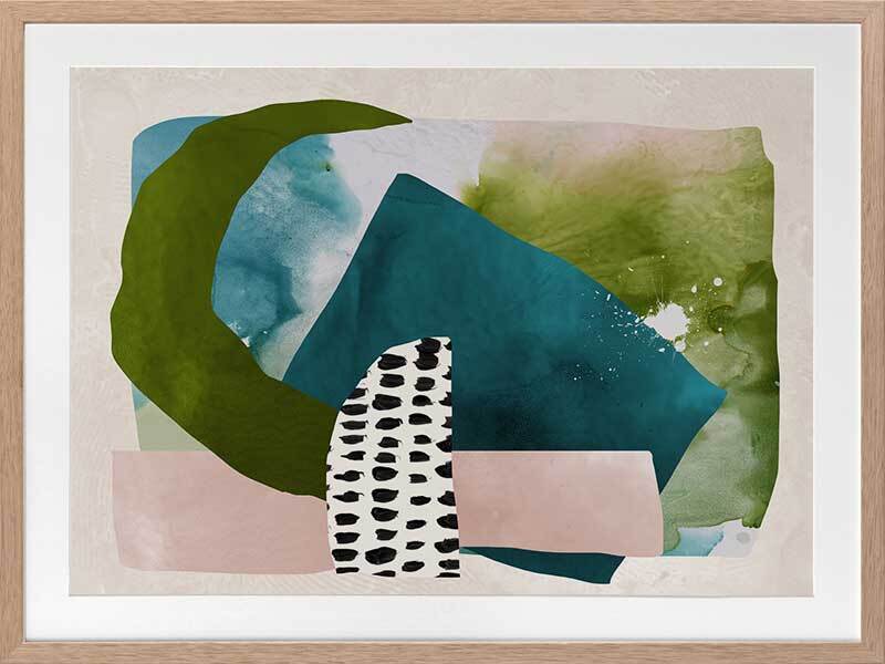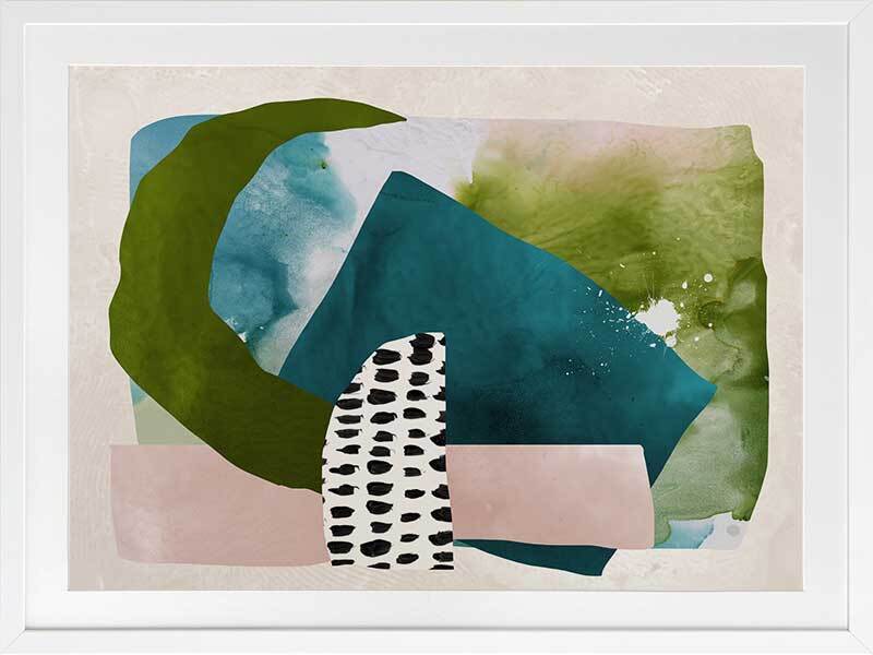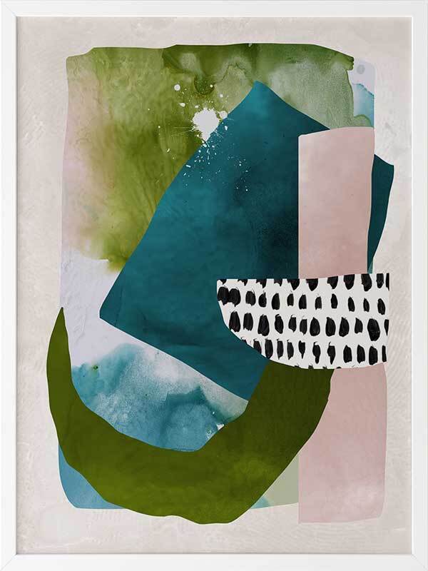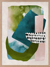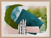 Paper Towns II Framed Print: A fresh, playful abstract artwork featuring overlapping shapes, forms and patterns in teal, green and pink. Pairs with Paper Towns I. 2020 AUTUMN/WINTER COLLECTION: REVERIE