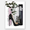 Passion For Fashion Unframed Art Print - Like peering through the store windows on the streets of Paris, this piece features all the staples for a fashionista, from a powerful stiletto heel, to a bottle of Chanel Coco Noir, to a bookshelf bursting with fashion books through the ages. With a monochrome colour palette of black and white, hints of blush pink and soft green come through for a pop of colour.