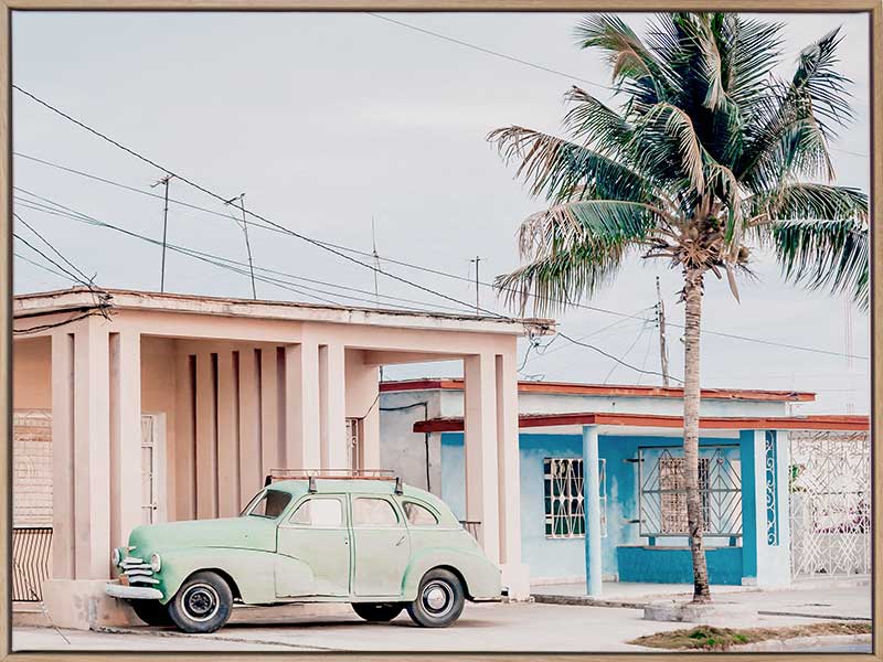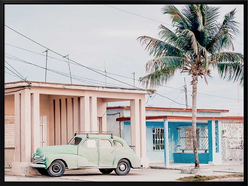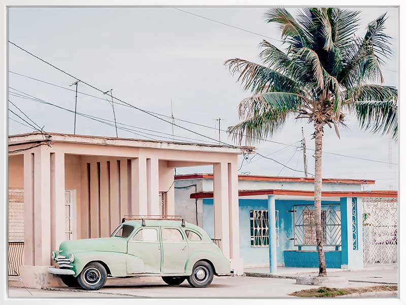Pastel La Palma - A playful, vintage inspired photographic print that features a classic mint green beach wagon parked outside pastel coloured buildings in South America.