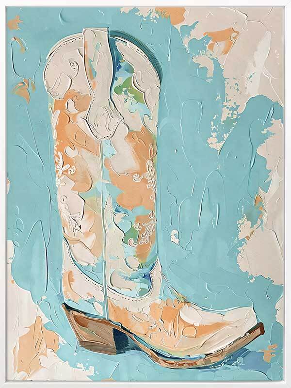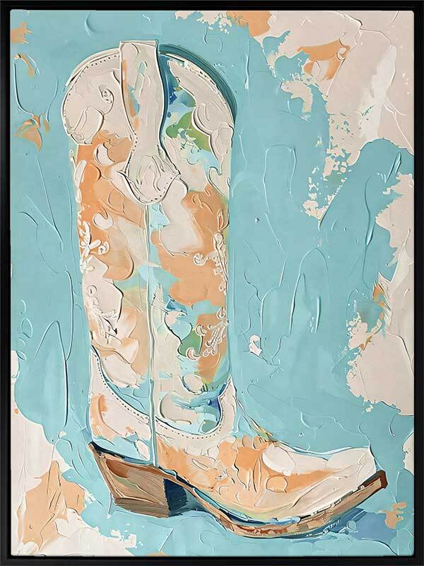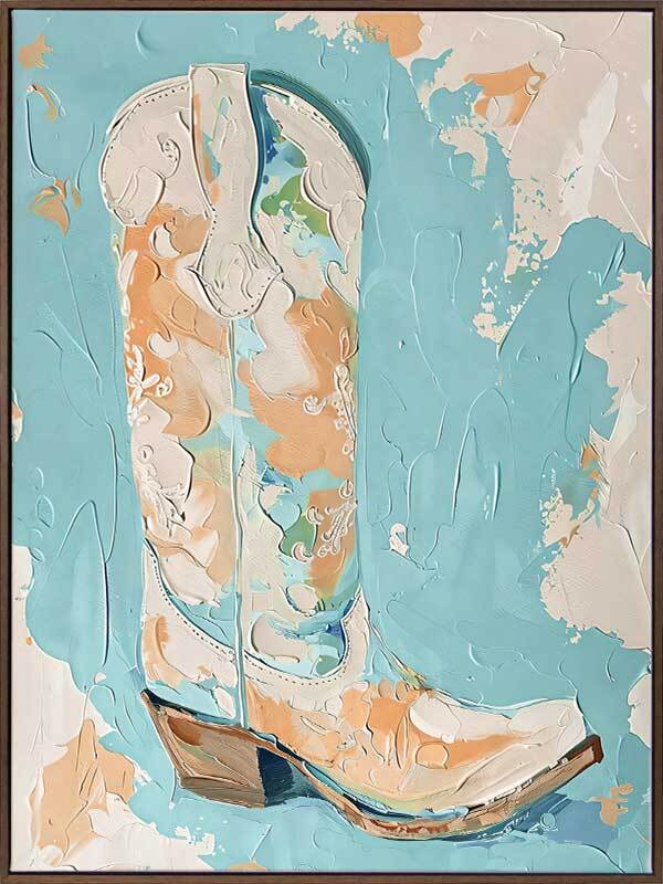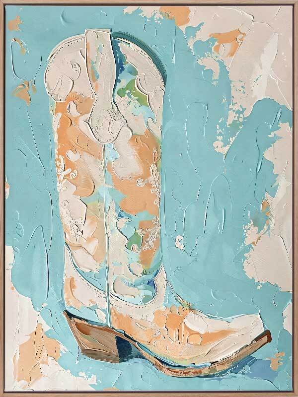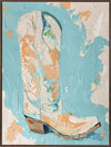 Pastel Rodeo Canvas Art Print - Inspired by abstract composition, this American Western-themed artwork is like no other with a bright, playful palette of pastel blue and orange, balanced by cream hues. This single cowboy boot is a symbol of the free-spirited energy of the Wild West, bringing a sense of whimsy to your home.