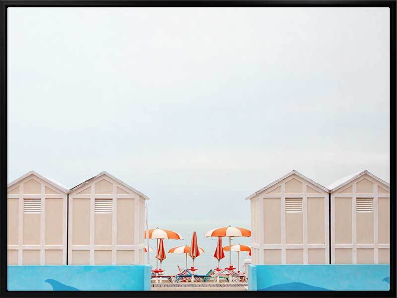 Pastel Umbrella Art Print - This bright and relaxing photograph of a beach scene depicts bathing boxes lined up in a row with the beach boardwalk rolling by in front. You can imagine relaxing in the loungers underneath the orange and yellow beach umbrellas and taking in the inviting sea view, wall art that will help you escape. THE CURATED SERIES II A handpicked gallery of wall art photography that is daringly and quirky, these photographic pieces are exploding with richness of colour and texture.